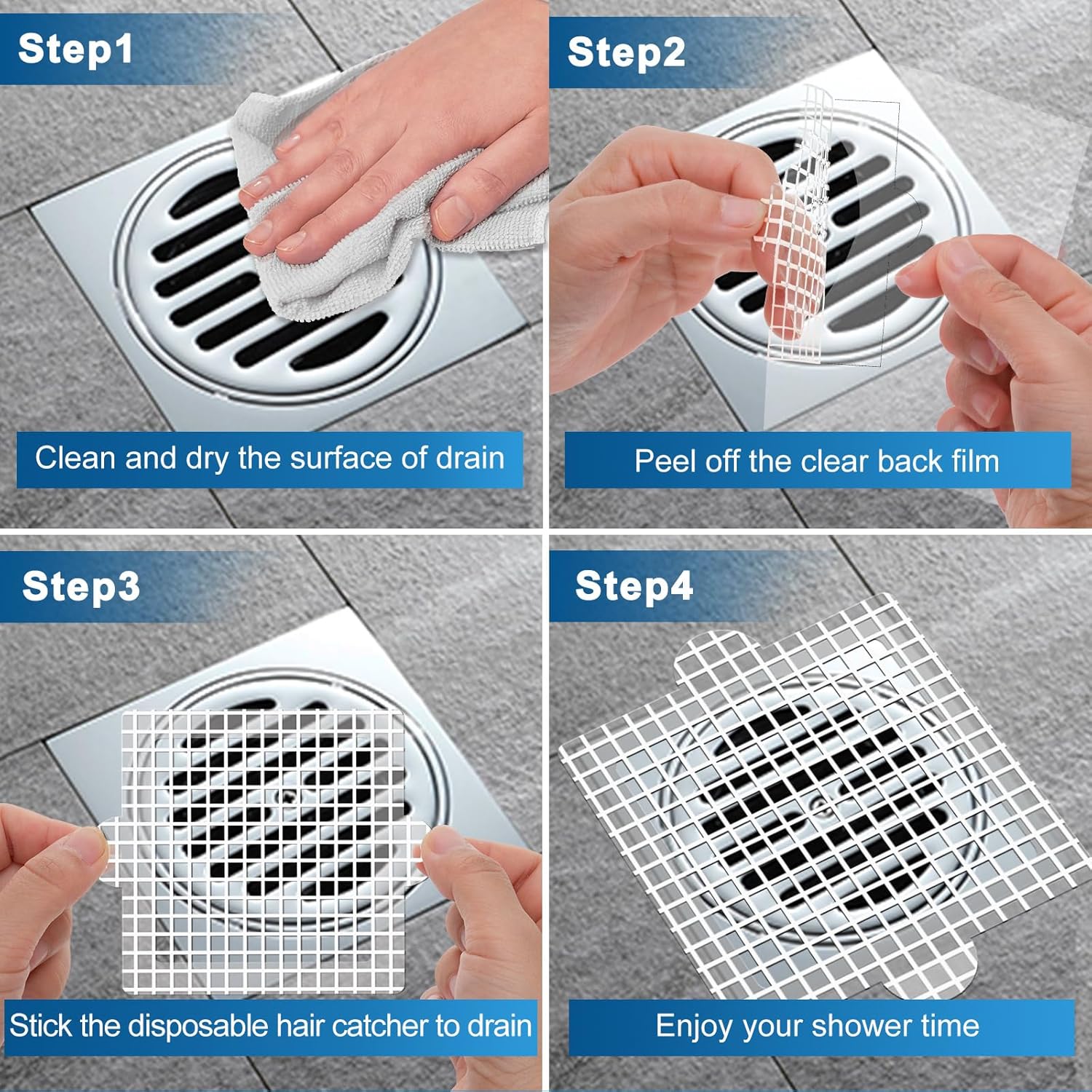 - WIDE COMPLICATION: This hair stopper for shower drain is designed to stick to surfaces of 4.1" or less in size drain, whether it is round or square, and how deep the drains are. It can also work on drains of many materials which made it a highly recommended bathroom accessory for apartment. Tip: make sure the drain surface is completely dry and clean before pasting the disposable drain hair catcher on