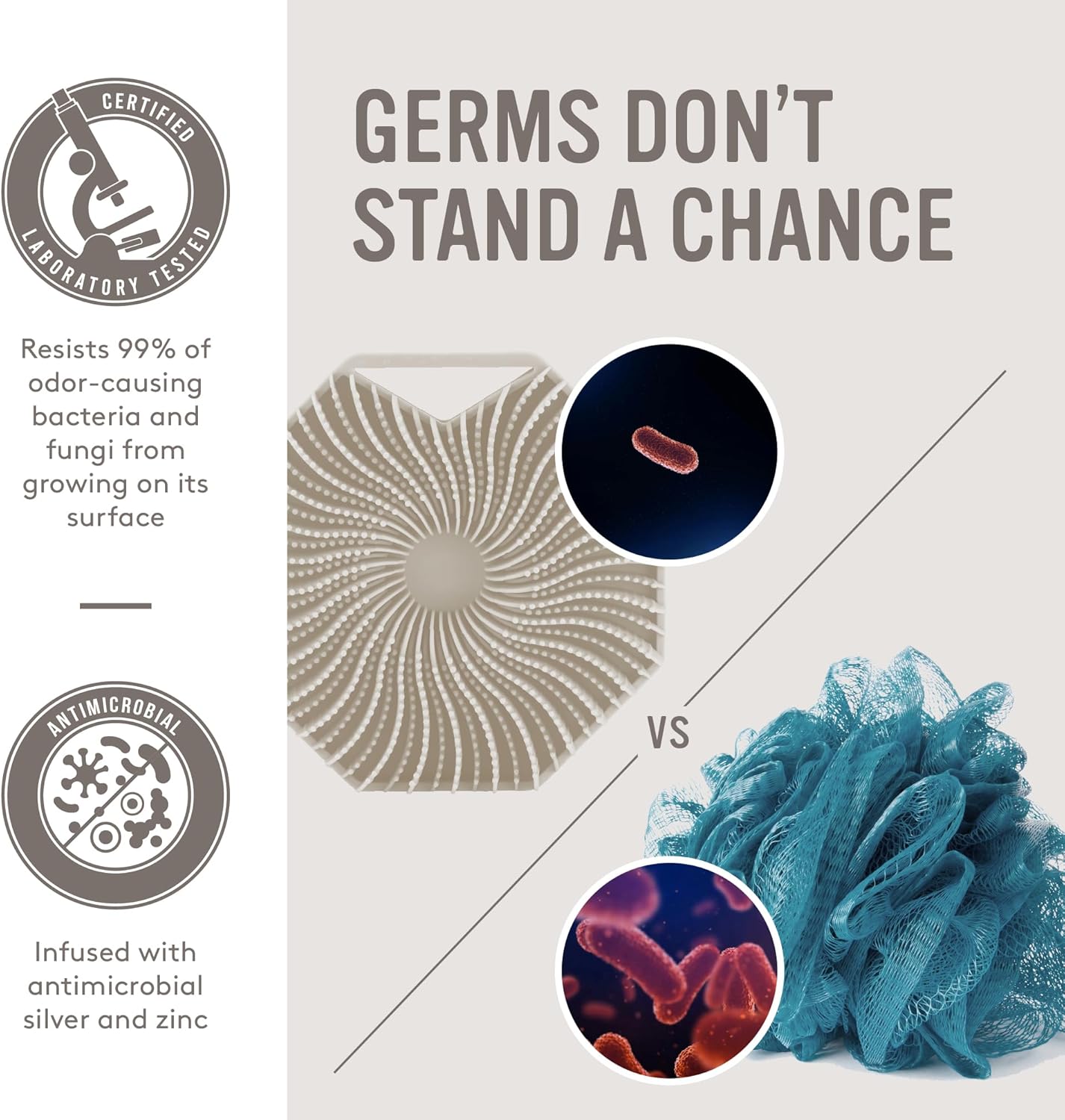 - ANTIMICROBIAL - Compared to cheap silicone scrubbers that claim to be hygienic, Sud Scrub is the only silver and zinc-infused silicone shower brush that is proven to resist 99% of odor-causing bacteria and fungi from growing on its surface.