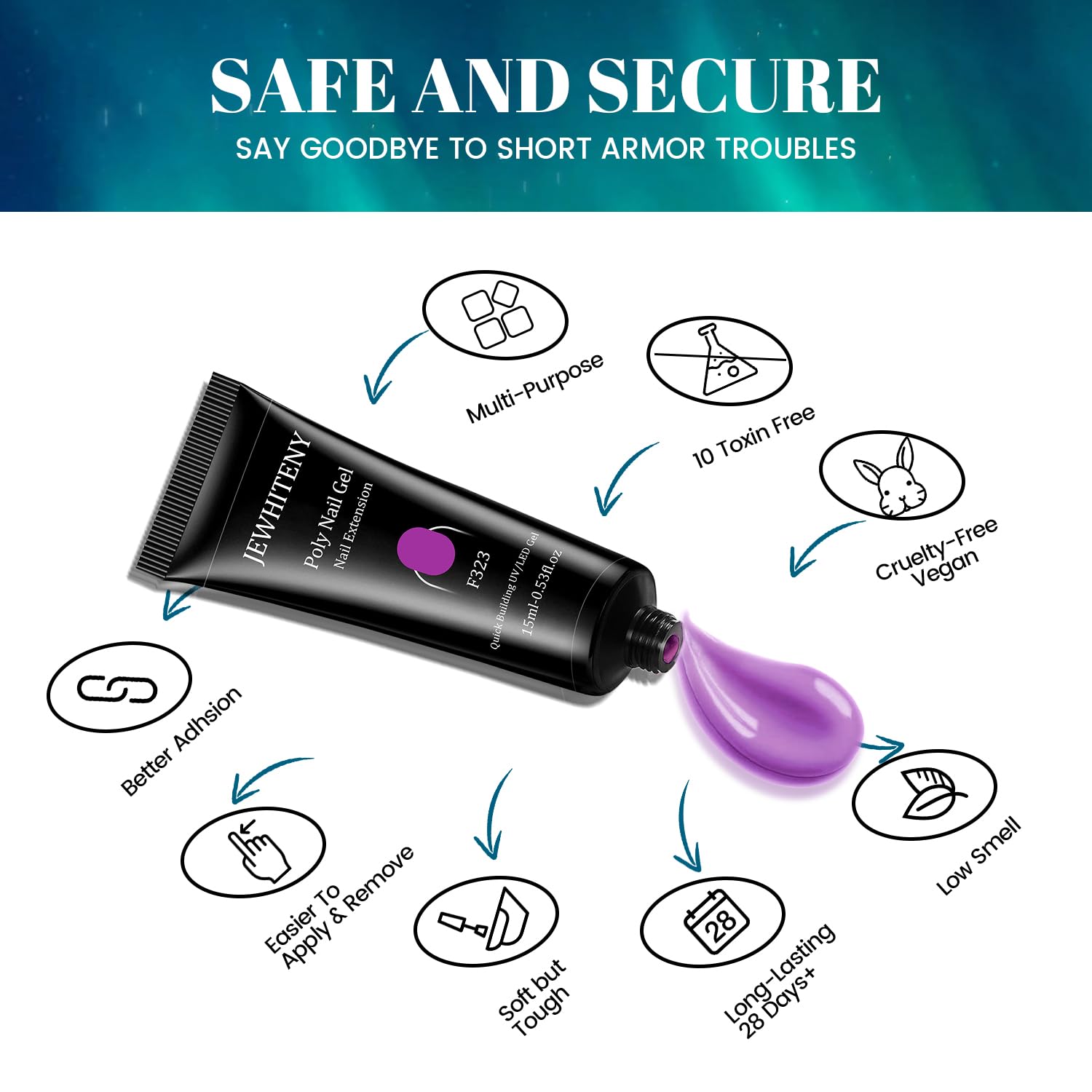 - 【HEALTHY,NATURAL,FLEXIBLE】:JEWHITENY poly gel made with non-toxic ingredients keeping your nails healthy with a low odor formula!superior to other nail extension products, and fits your nails seamlessly.The new upgraded formula makes your lengthened nails as flexible, strong and lightweight as natural growing nails.Double the beauty, but without the extra burden.