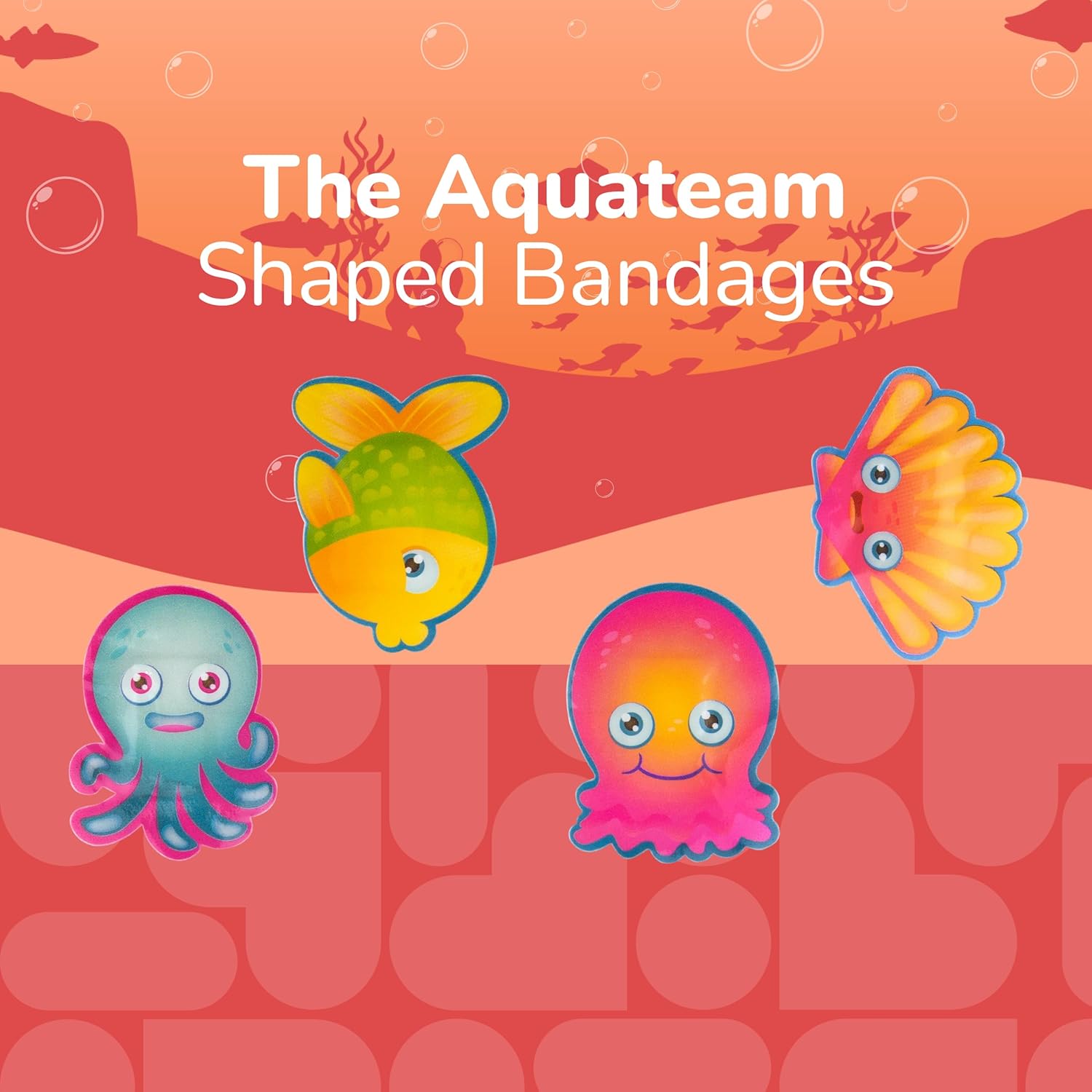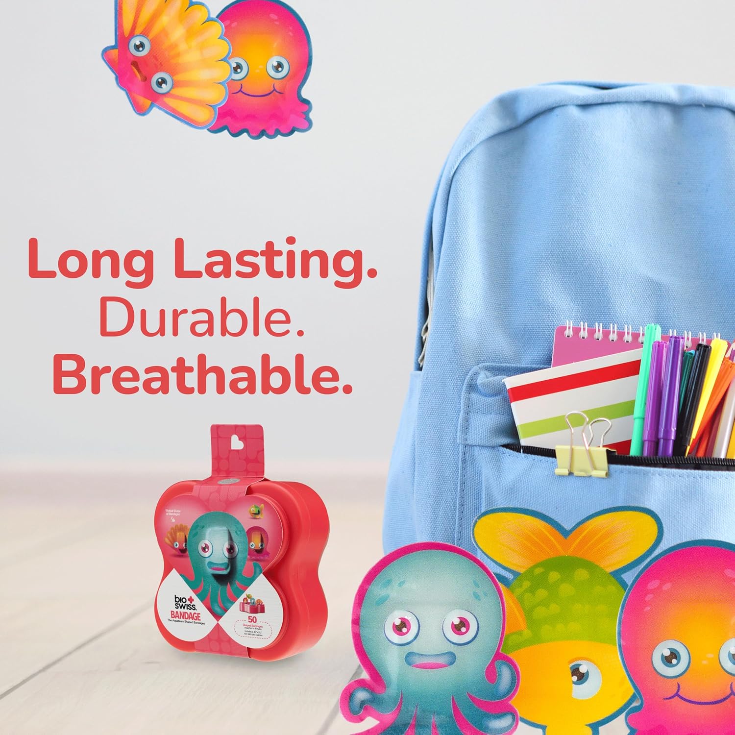 BioSwiss Kids Bandages, Aquateam Sea Creatures Shaped Self Adhesive Bandage Set, Latex Free, Sterile Wound Care, 50 Count