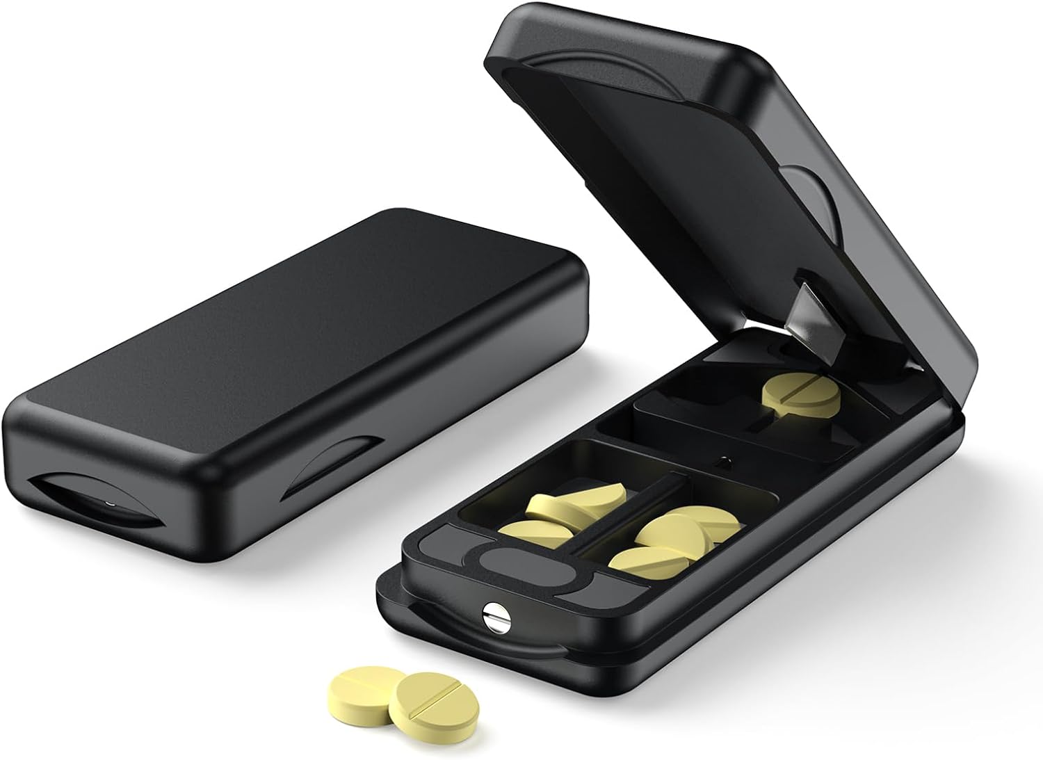 Pill Cutter with Auto Centering Device, Aluminum Pill Splitter with 316L Stainless Blade, Genuine Leather Case, Professional Pill Splitter for Cutting (Plastic,Black)