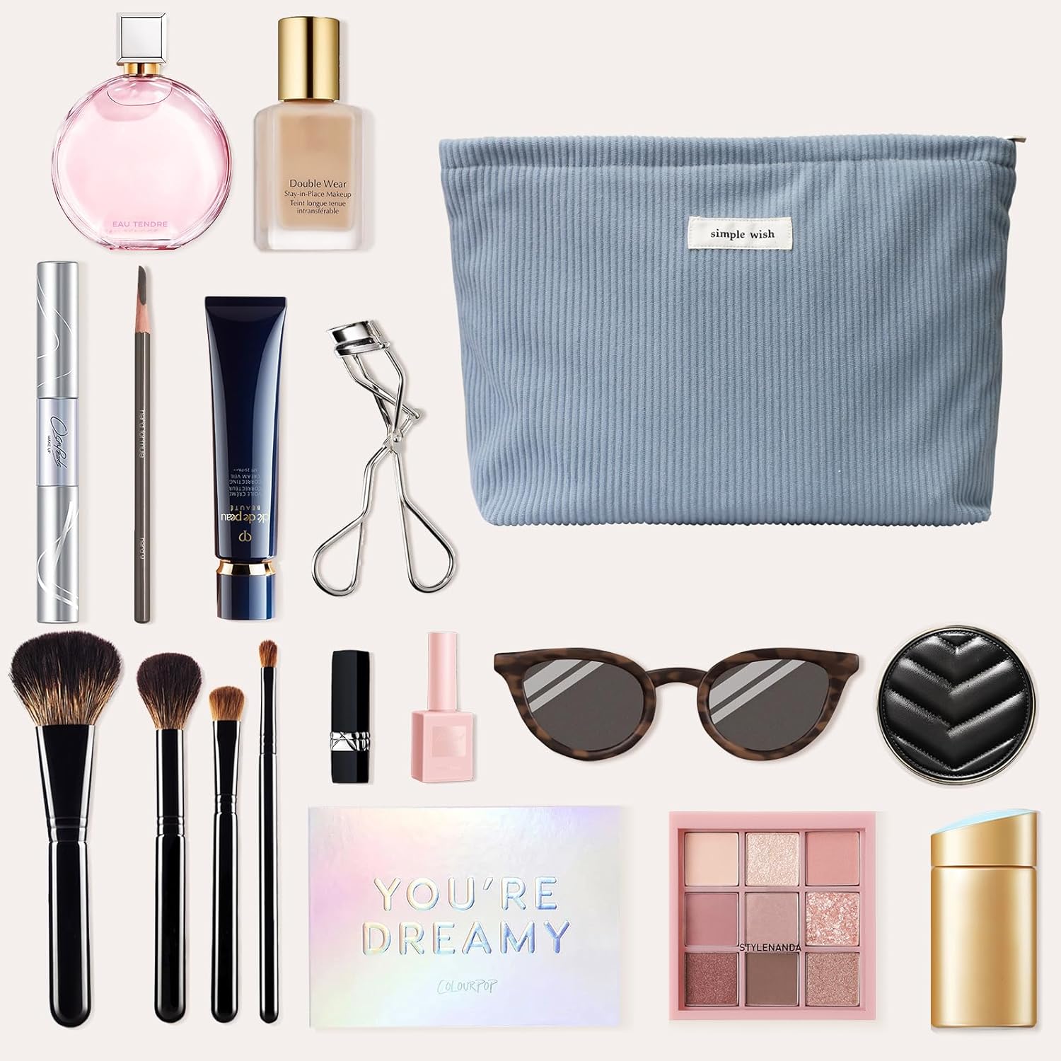 Wudygirl Makeup Bag Portable Cosmetic Bag Travel Makeup Pouch for Women and Girls Large Capacity Corduroy Travel Toiletry Bag (Light Blue)