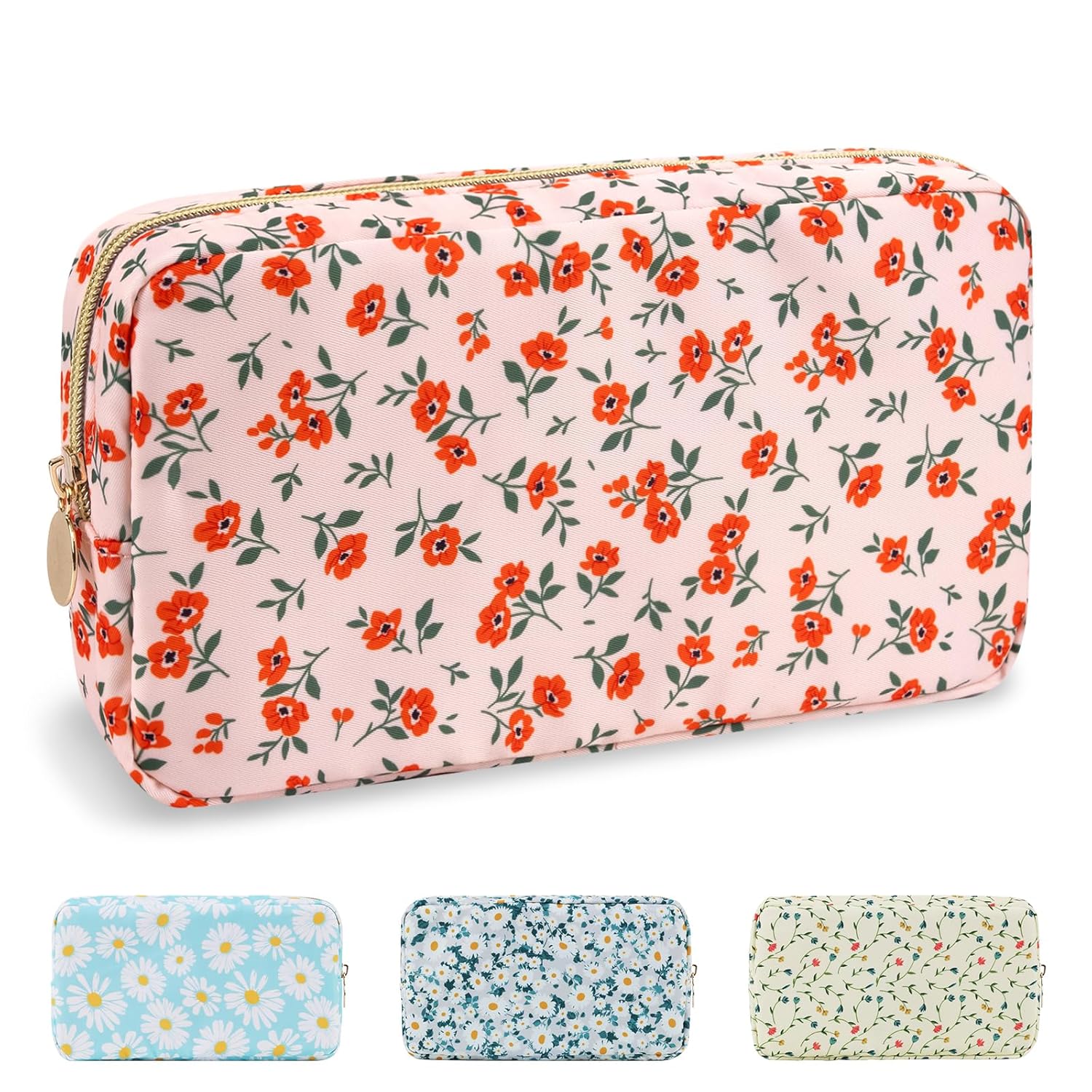 Waterproof Small Floral Makeup Bag Pouch for Purse,Nylon Flower Cosmetic Bag Preppy Travel Toiletry Storage Bag for Women Girl,Cute Makeup Organizer Bag Skincare Bag with Zipper(Small Pink-Flowers)