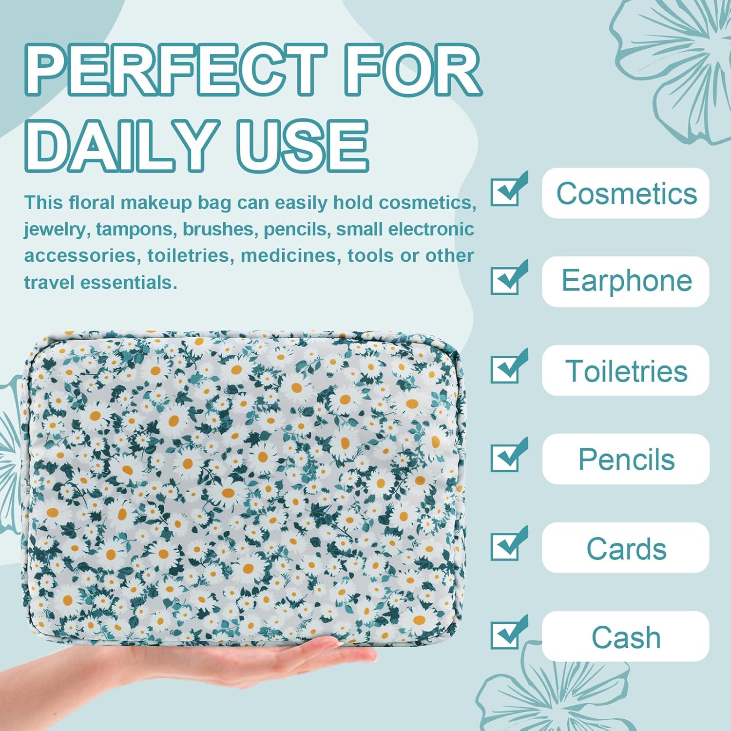 - 【Superior Quality】The floral makeup bag is made of lightweight and durable high quality nylon. It is waterproof and easy to clean, helping to protect your cosmetics and toiletries from water spill accidents.