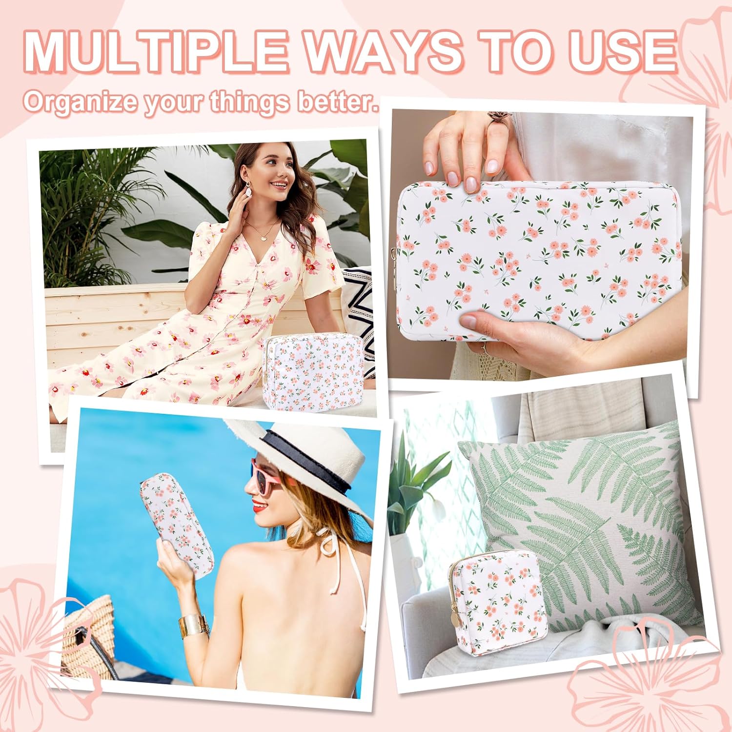 Waterproof Small Floral Makeup Bag Pouch for Purse,Nylon Flower Cosmetic Bag Preppy Travel Toiletry Storage Bag for Women Girl,Cute Makeup Organizer Bag Skincare Bag with Zipper(Small White-Flowers)