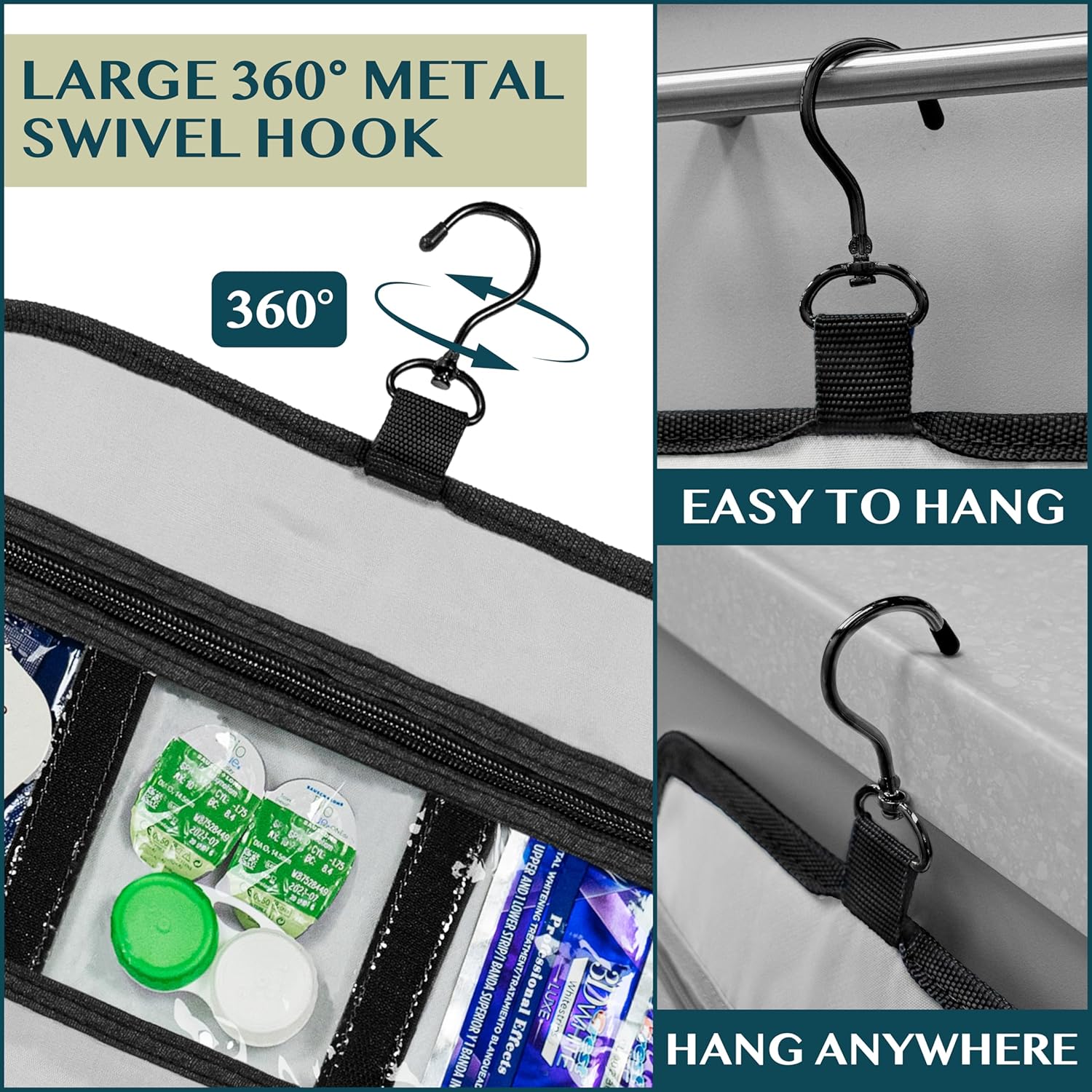 • HANGING COSMETICS TRAVEL BAG ORGANIZER: This toiletry bag for women has a hanging hook and multiple pockets that help you stay organizer during business trip, vacation travel. The hanging hook makes it easy to hang the toiletry bag to bars in the hotel shower bathroom. Unzip your toiletry bag to reveal compartments to organize your shampoo, skincare face hygiene products. This toiletry travel bag is an essential accessory for cruise in Europe, plane, Hawaii Trip, and honeymoon.