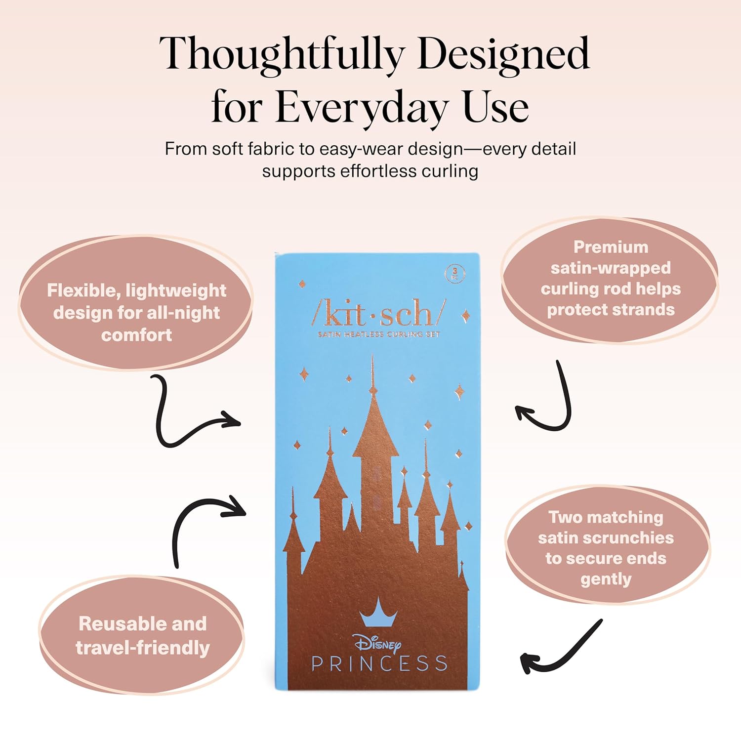 Disney & Kitsch Satin Heatless Hair Curler Set - Heatless Curls Overnight, Hair Rollers for Soft Curls & Frizz-Free Styling, No Heat Curlers To Sleep in, Curling Rod Headband - Princess Party