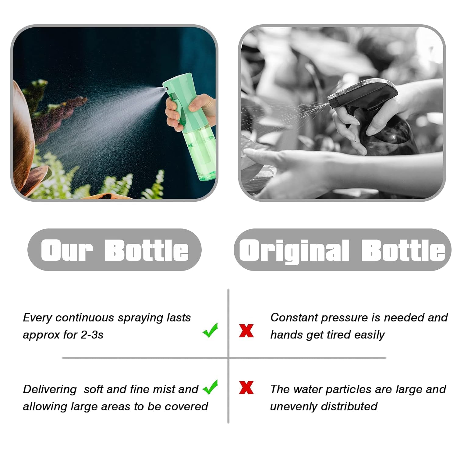- 【Continuous Spray】The continuous spray bottle is engineered with robust pre-compression technology, which produces a mist stream that lasts for several seconds with just a few gentle presses.