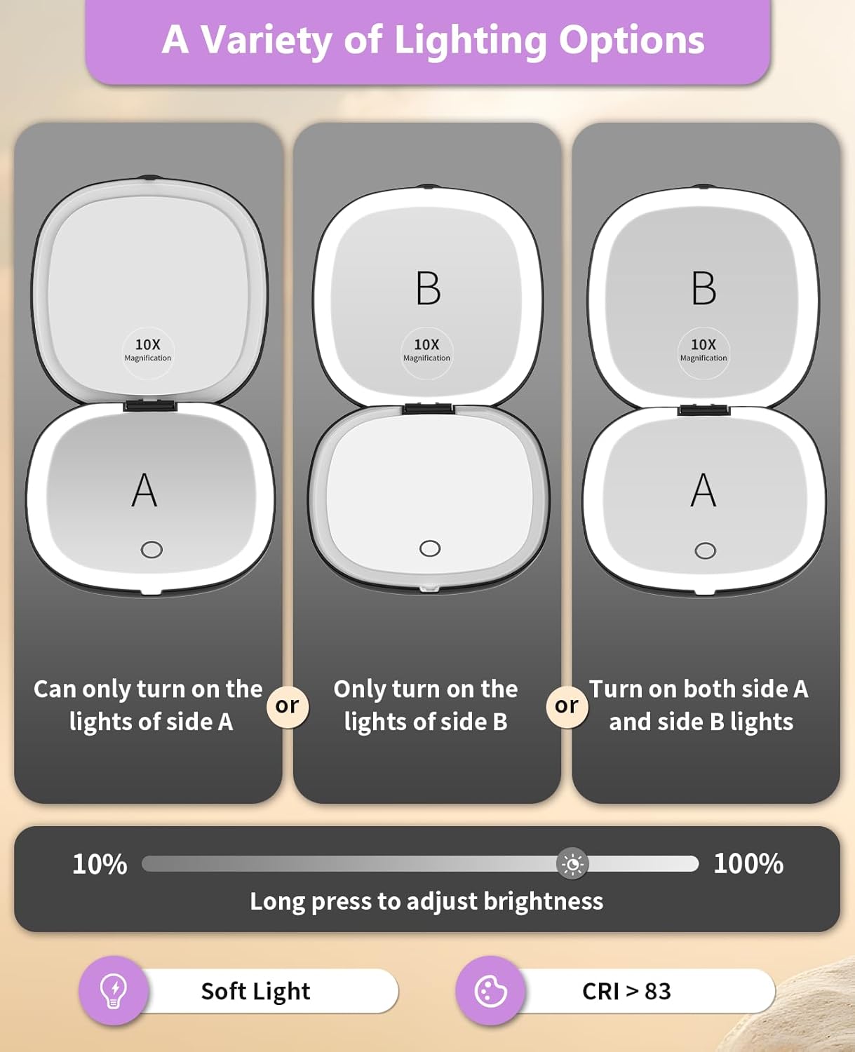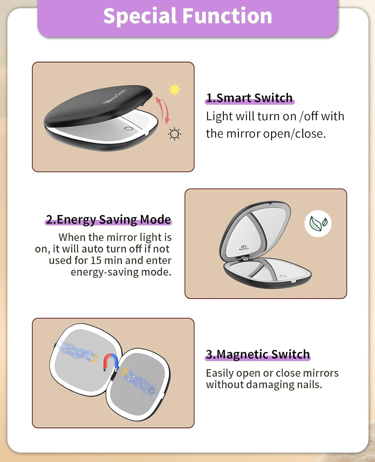 - 10x Magnifying:One side is a 1x HD mirror, equipped with white light to better restore your beauty, and the other side is a 10x magnifying mirror, which can help you magnify facial details. Tip: When using the 10x magnifying mirror, please keep a distance of less than 10 cm, otherwise it may cause normal dizziness and affect imaging
