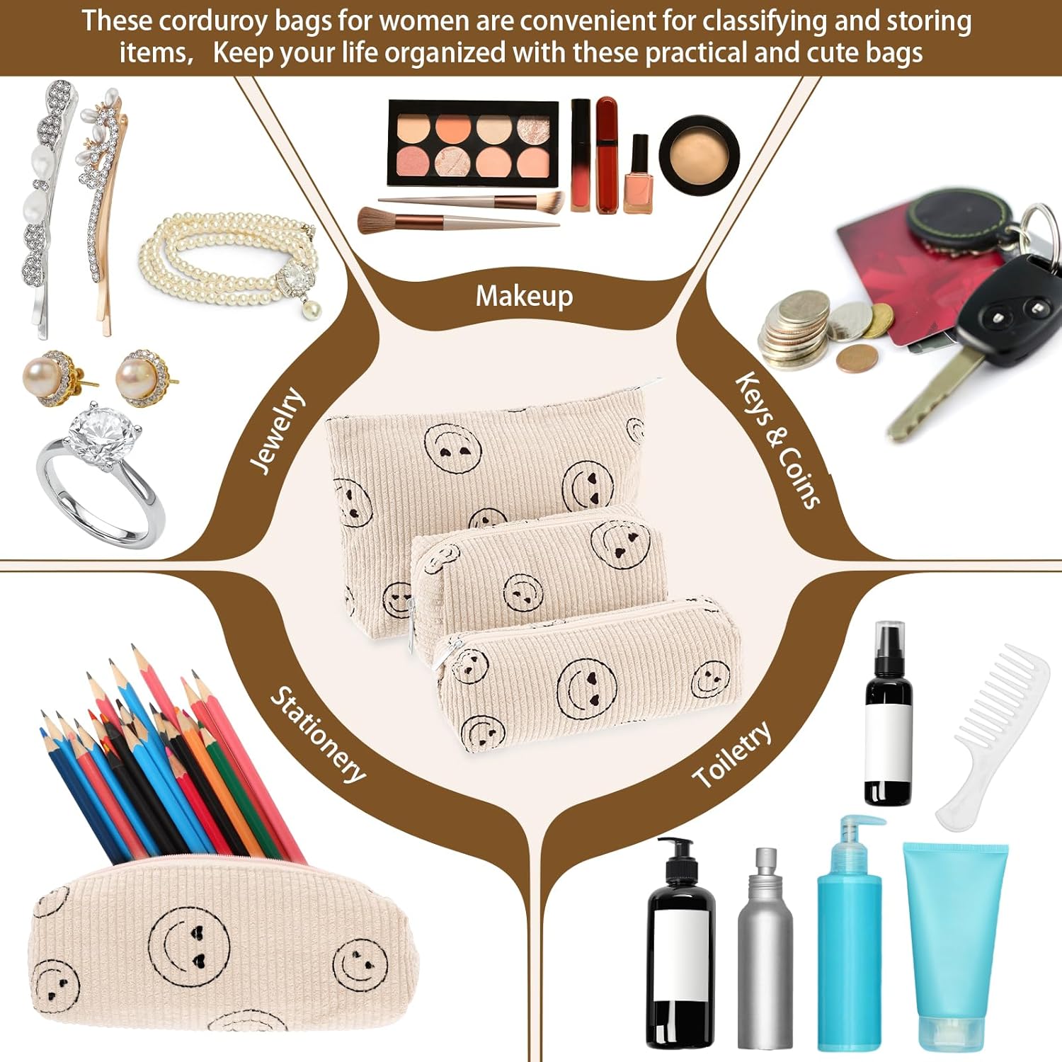 3 Pcs Makeup Bag Set for Women Corduroy Cosmetic Pouch Aesthetic Smile Travel Toiletry Bag Cute Purse Pouch Pencil Case Makeup Brushes Storage Organizer for Christmas(Beige,Smile Face)