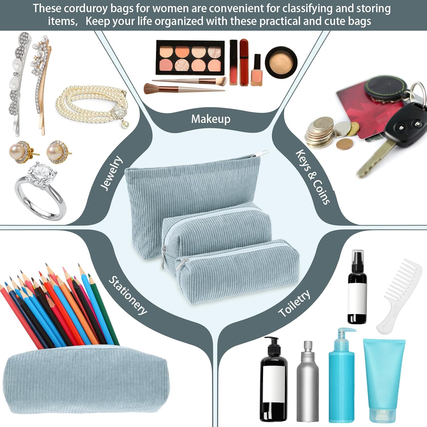 - Material and Attractive Design: the makeup and toiletry travel bag set is mainly crafted from quality corduroy material, ensuring high durability and prolonged service life; The bags feature solid blue color design in different sizes; This makes them compatible with various styles of outfits