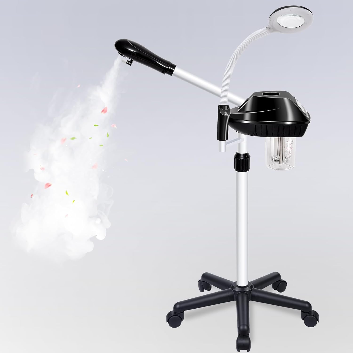 - 【Facial steamer on wheels】 Stand Facial Steamer with a pentagon-shaped load-bearing base,Good load bearing, smooth movement, Use of lightweight and high-strength materials.
