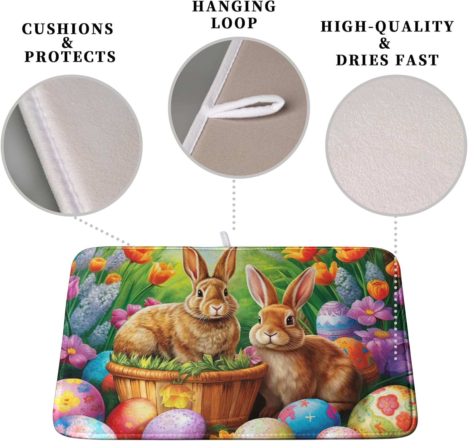 Easter Bunny Eggs Dish Drying Mat for Kitchen Counter, Tulip Floral Flower Drying Mat Spring Summer Holiday Dish Mat Drying Kitchen Mat Absorbent Kitchen Drying Mat for Sink 18x24Inch