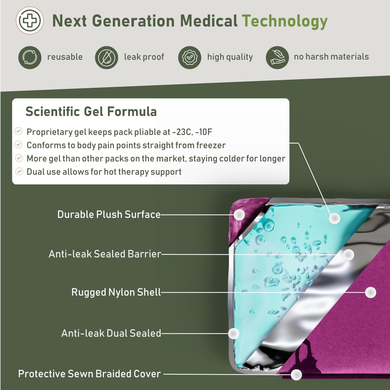 - DUAL-SIDED APPLICATION - Our large ice pack wrap is designed so you can enjoy the best of both worlds. Use the nylon side wrapped in a thin cloth for ultra-cold therapy. For a softer and subtler experience, apply the plush side directly to the skin without frostbite. Our soft ice packs stay pliable.