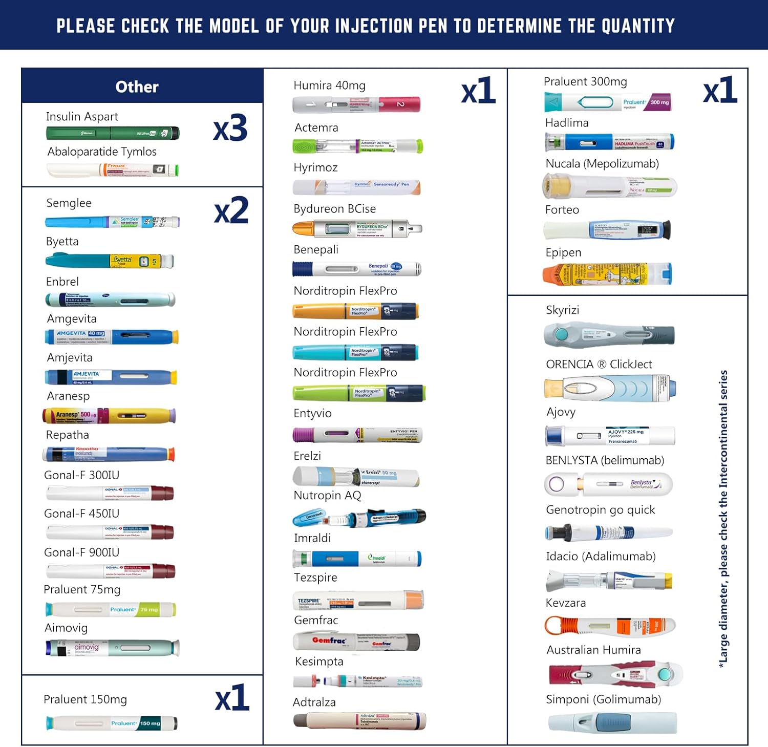 - How many injection pens can I put in : We have obtained the sizes of 95% of the common brands of injection pens on the market and made a detailed capacity reference chart. 1)You can find a table on our page for reference to buy the right cooler. 2) If you can't find your injection pen model, please be sure to contact us, we will be happy to help you solve your problem