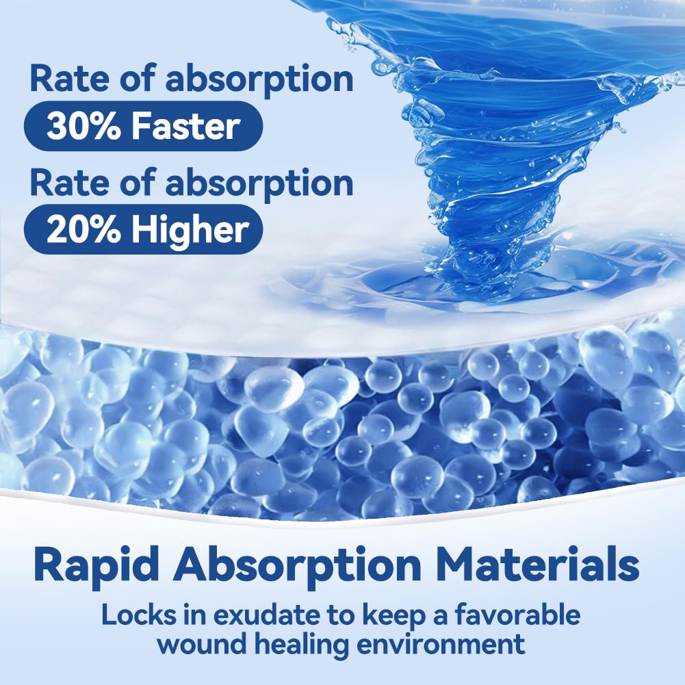 - 1S Instantly Absorbs&Locks in Exudate - The unique SAP-composite absorbent core has high absorption properties, converting exudate to gel in 1 second, reducing the risk of maceration. It also absorbs up to 20 times its own weight in exudate, reducing the frequency of dressing changes
