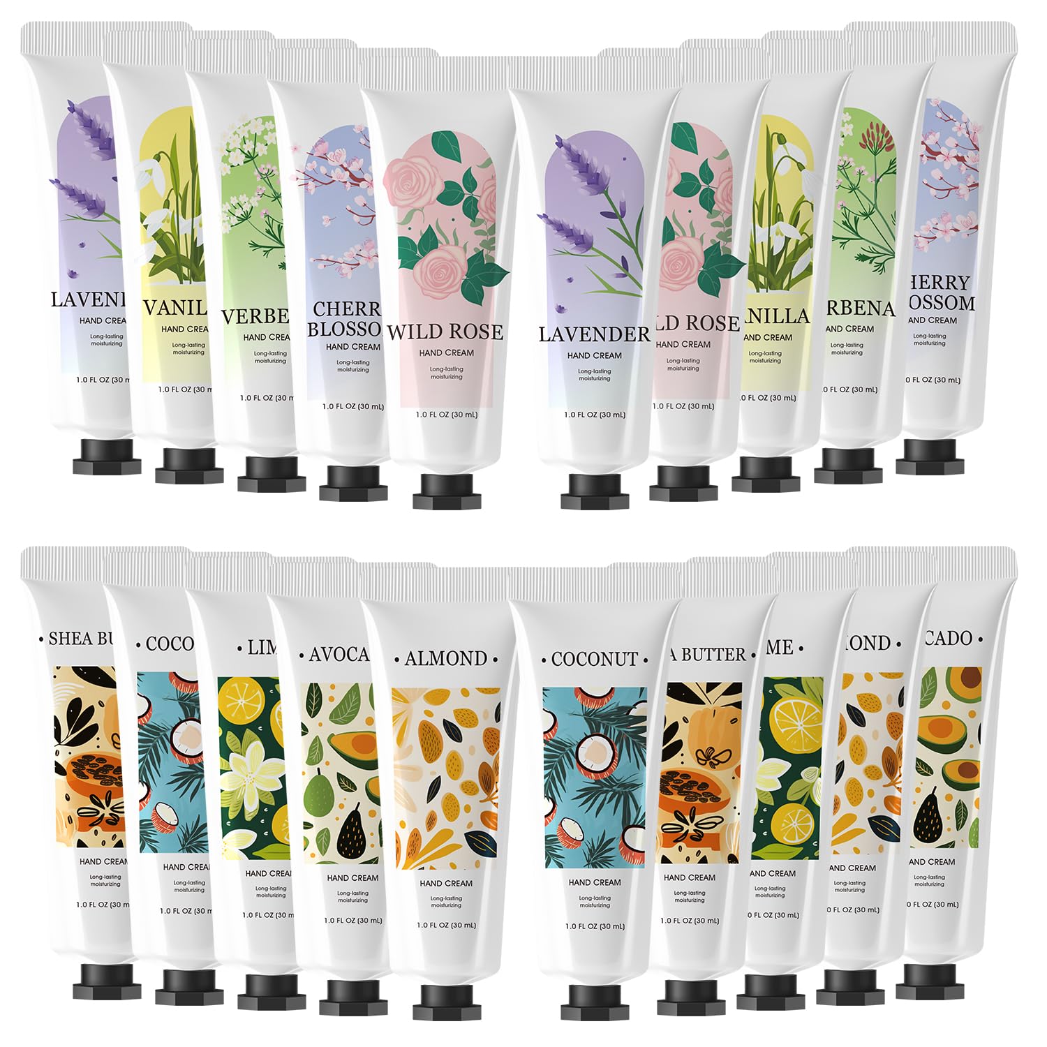 - 20 Pack and 10 Natural Scents for Every Mood – This hand cream set includes 10 delightful scents: lavender, vanilla, verbena, cherry blossom, wild rose, shea butter, coconut, lime, avocado, and almond. Each scent is naturally refreshing, making this hand lotion gift set both versatile and enjoyable for daily use. Perfect for anyone who loves a variety of mini hand lotion options.