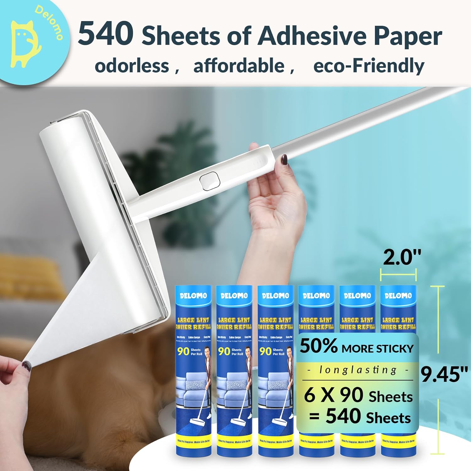 Lint Roller Refills (6 Pack, 540 Sheets) – DELOMO 9.45 in Large Lint Roller Refill, Compatible Only with DELOMO Floor Lint Roller, for Cleaning Carpets, Cars, Clothing & Pet Hair