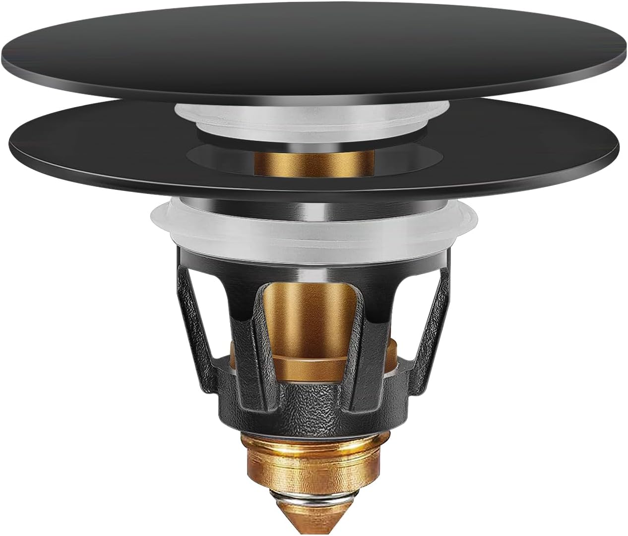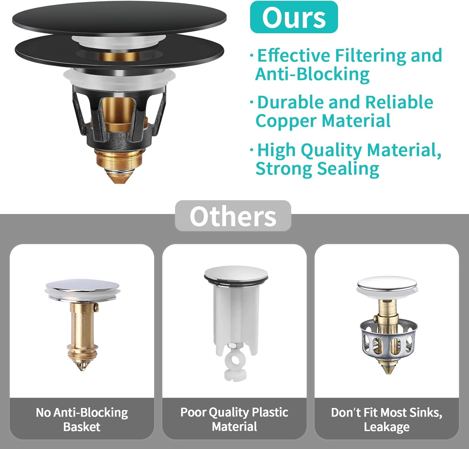 - [ Build-in Strainer ] The sink plug with an anti-blocking basket strainer inside which can collect hairs and prevent the drain from clogging up, achieving effective filtering, unlike regular push button drain. Suitable for bathtub, bathroom and kitchen sink, and so on.