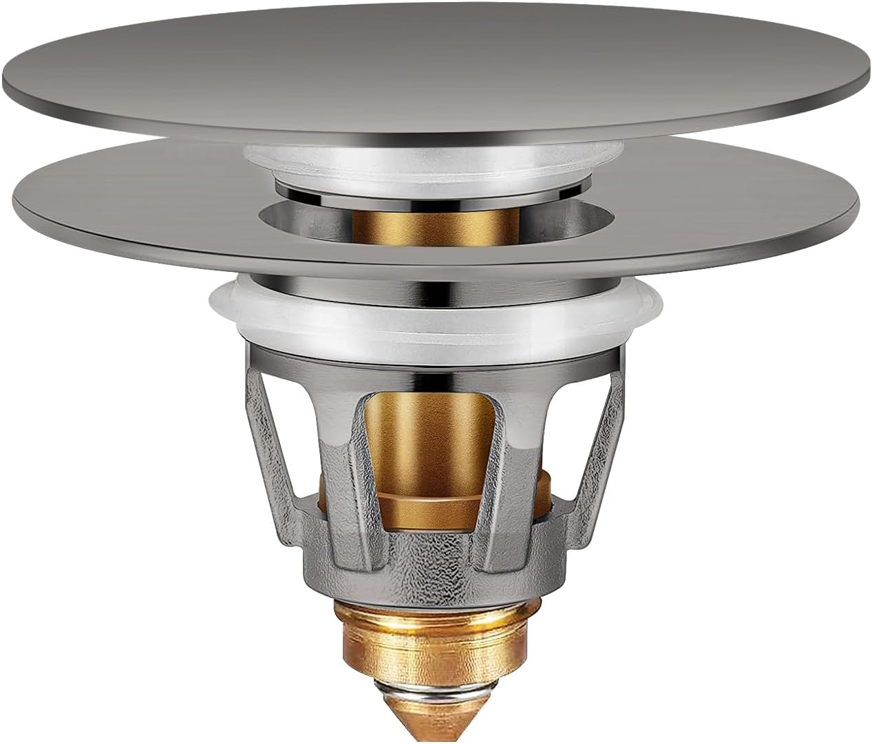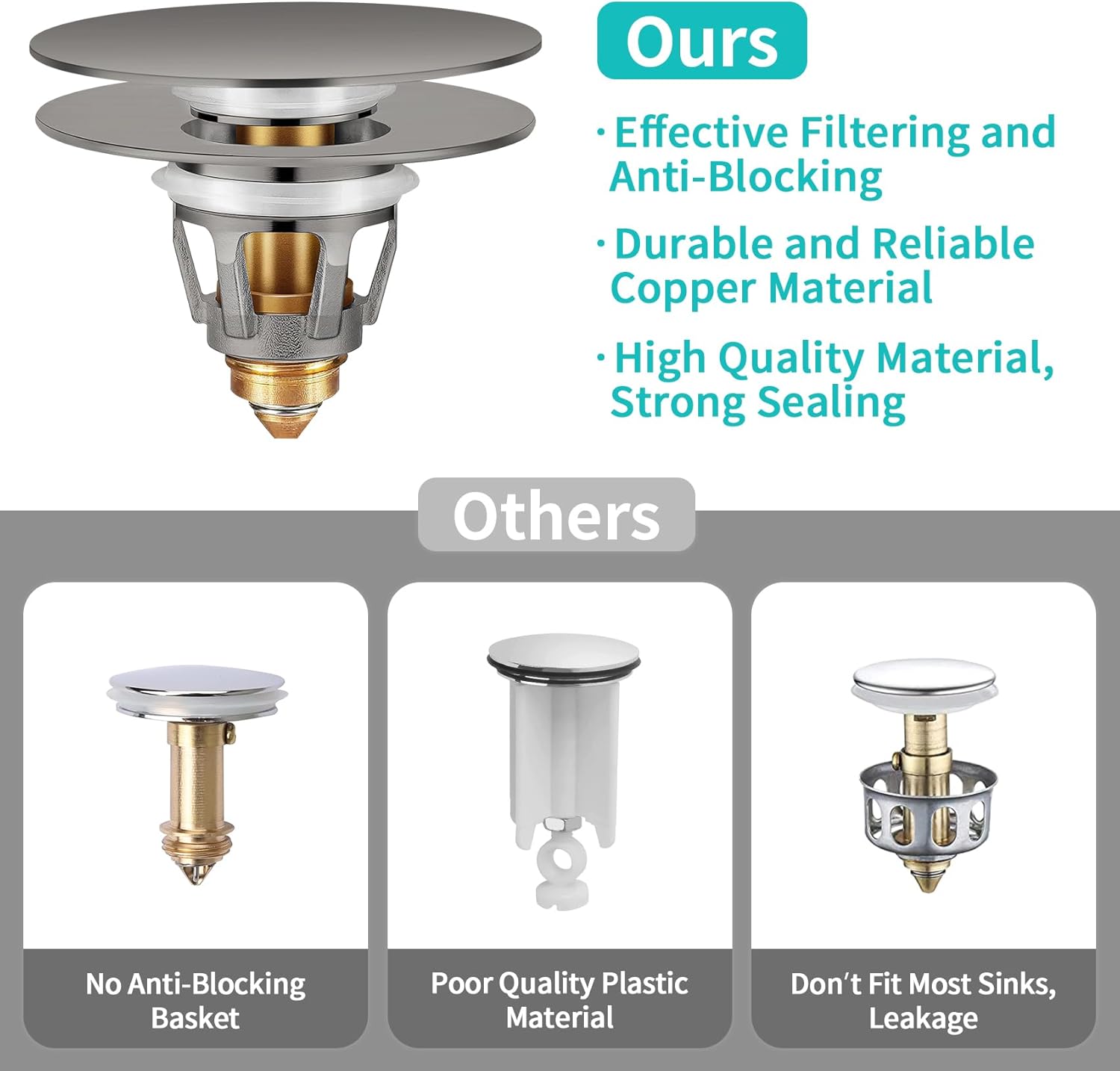 - [ Build-in Strainer ] The sink plug with an anti-blocking basket strainer inside which can collect hairs and prevent the drain from clogging up, achieving effective filtering, unlike regular push button drain. Suitable for bathtub, bathroom and kitchen sink, and so on.