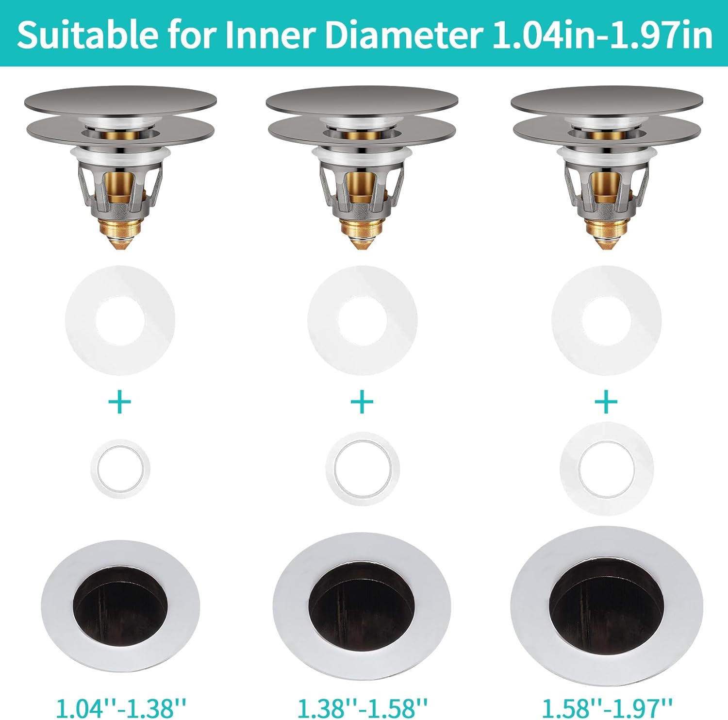 - [ Easy to Install ] No tools are needed, it can be installed easily with bare hands. You just take out the old bounce core and install a new bounce core. Anyone can install the pop-up drain because of its simple structure. If you want to use it for a larger sink hole diameter, you can use the rubber ring we included to increase the inner diameter of the sink plug.