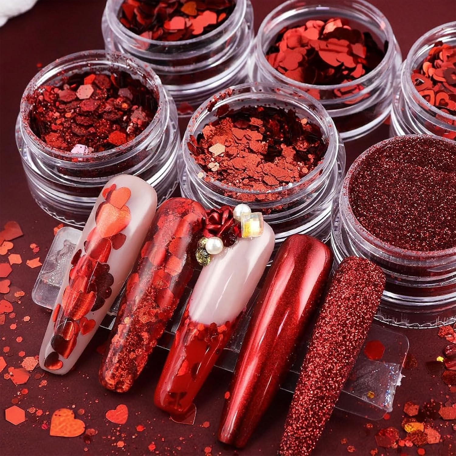 - 【Heart Glitter】-- You will get 1 grids red manicure fine glitter powder and 5 grids red glitter nail art sequins (heart, hexagon), A variety of style for you to choose DIY to decorate your nails on Valentines Day and sweet day.