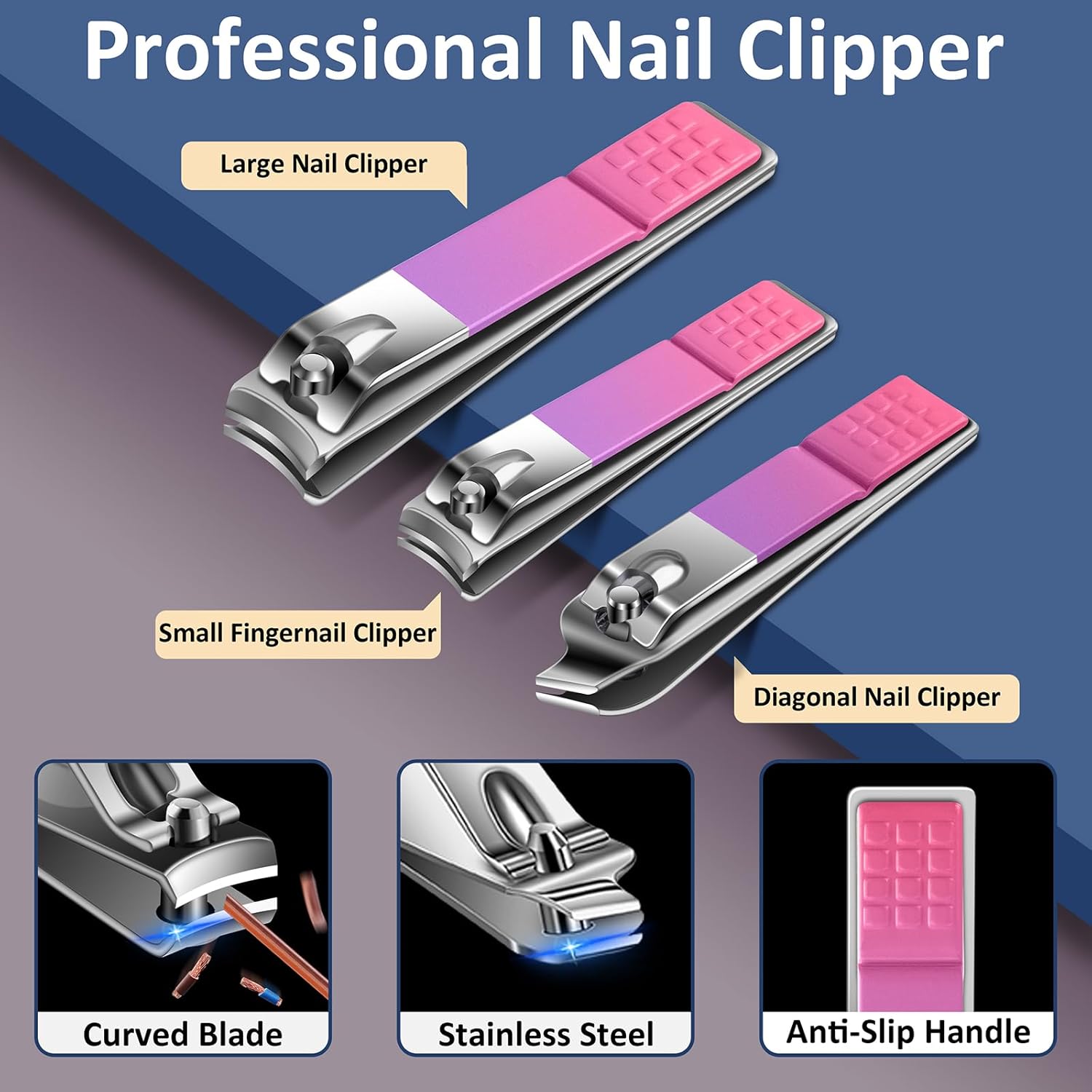 - Professional Nail Kit Manicure Set: Nail set manicure made of high-quality material. Manicure pedicure kit have 3 different nail clippers, including large nail clipper, small nail clipper and diagonal nail clipper. Nail clipper set are sharp and durable. Keep your nails trimmed and free of spills, cracks and hangnails.