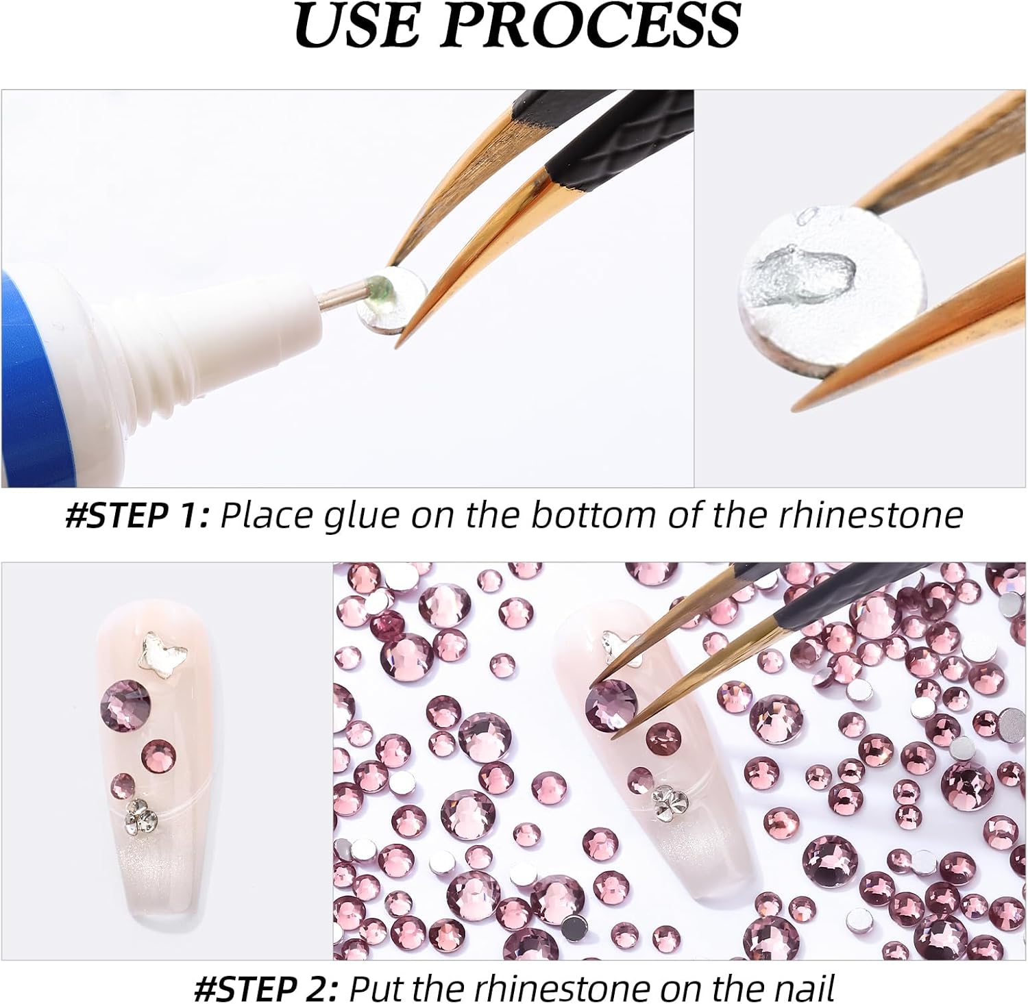 - Use tweezers and Picking Pen gem picker to pick rhinestones, There is no glue on the bottom, additional nail gel is required, or other professional glue for makeup or nails. Can use E6000/E7000 super glue to fix on crafts, art decoration. not hotfix