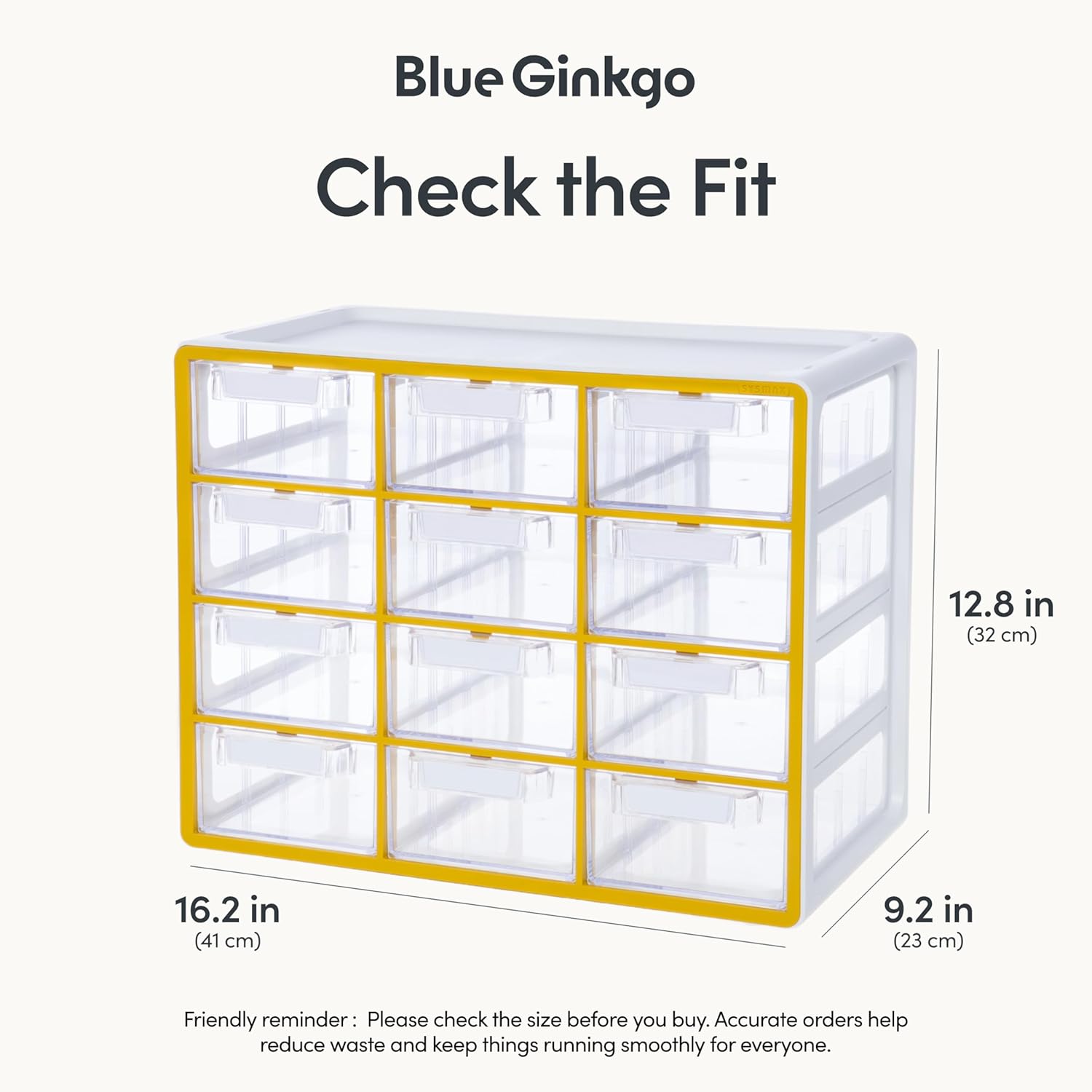 Blue Ginkgo Large 12-Drawer Cabinet – Stackable Clear Organizer for Hardware, Beads, Plastic Bricks, Office, and Craft Storage (Made in Korea, Yellow)
