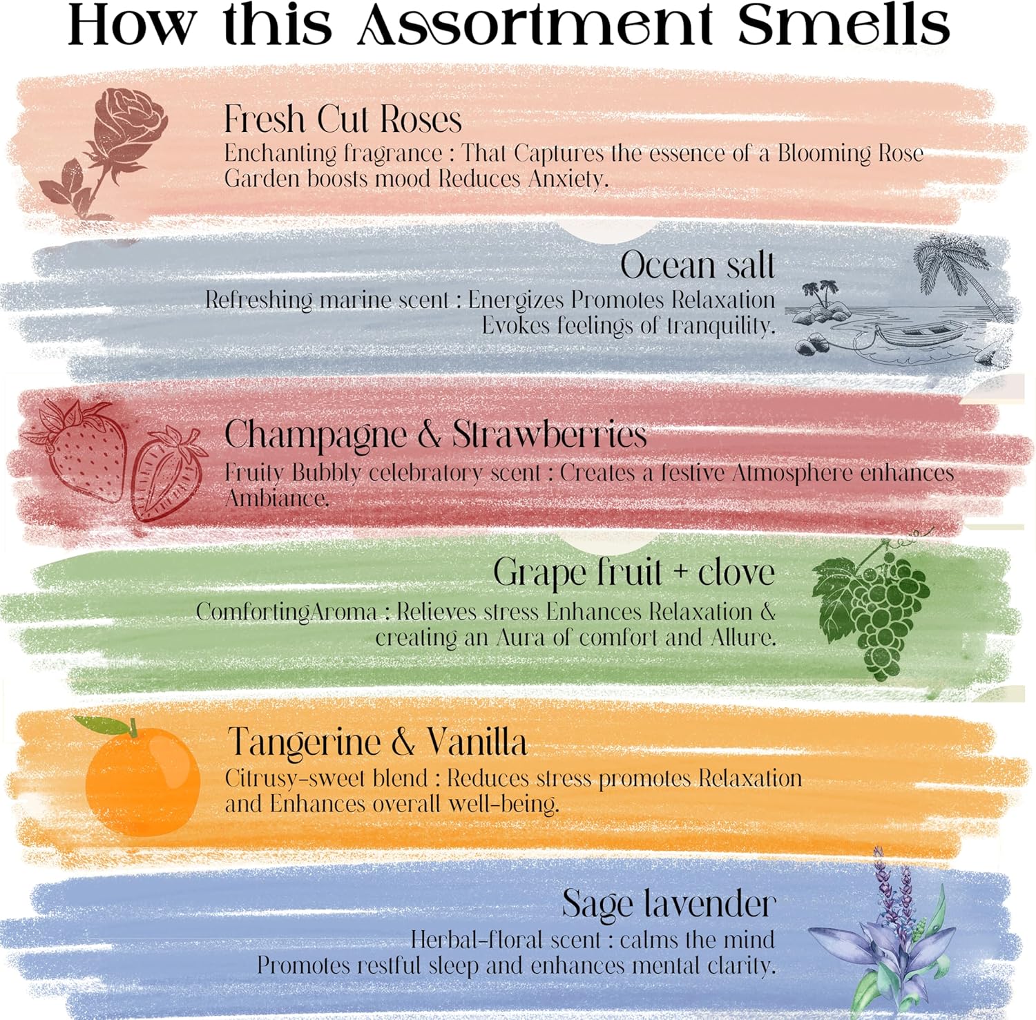 - Long-lasting Variety Pack: Enjoy 120 natural insence-sticks with a 45-minute burn time each, plus a complimentary holder. No black smoke emission. Explore six unique fragrances from floral and herbal to woody and exotic for any mood and occasion.