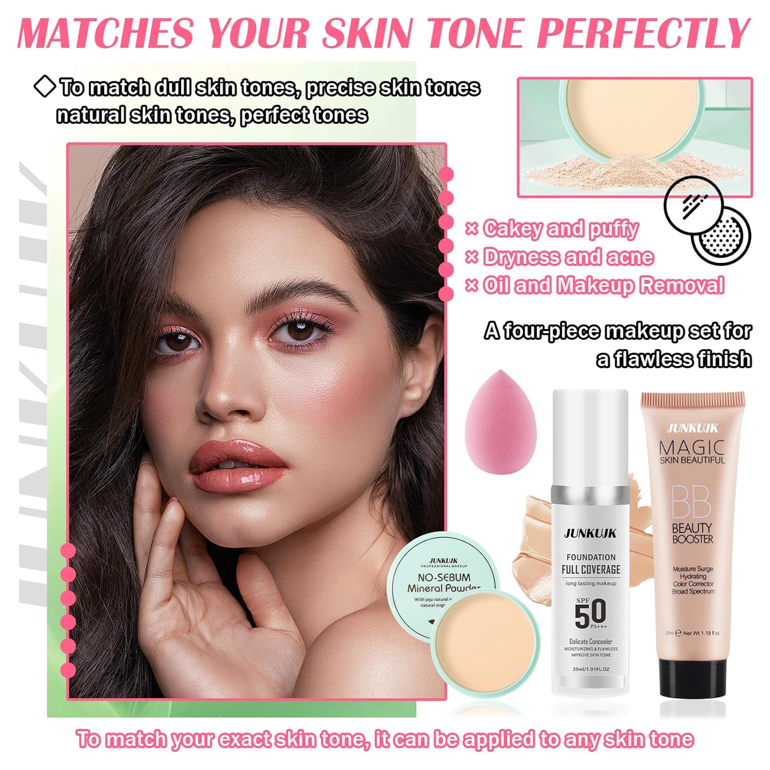 Color Changing Full Coverage Liquid Foundation Makeup Gift Set,Moisturizing BB Cream for Women,Flawless Loose Setting Powder Face Primer Base Makeup Kit With Make up Sponge