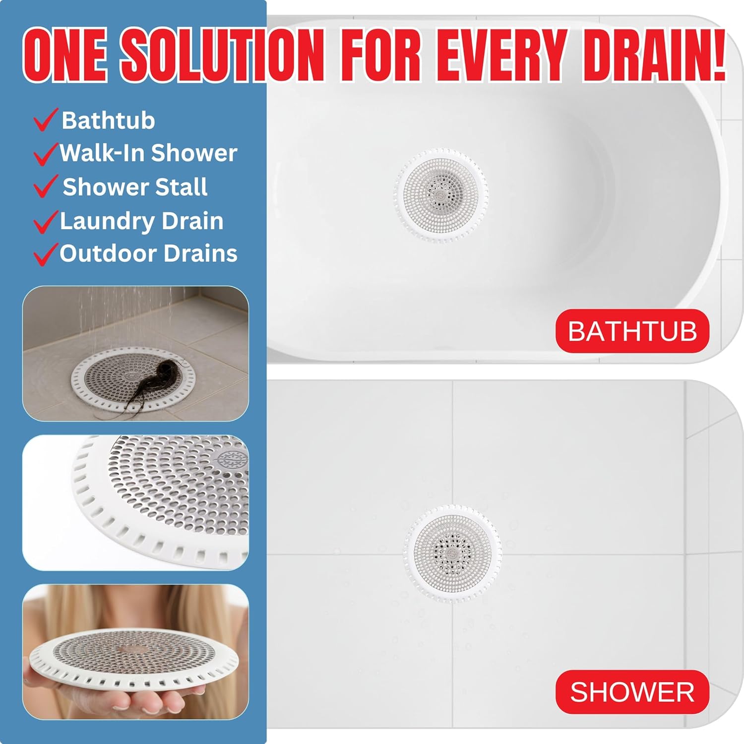 - Reliable Clog Preventer For Everyday Use: This shower drain protector and hair catcher is designed for continuous daily use in busy bathrooms. Acts as a durable drain hair catcher for shower floor that keeps pipes clear of buildup, reduces soap scum, and minimizes odor-causing clogs. A must-have shower drain strainer that saves time, money, and hassle.