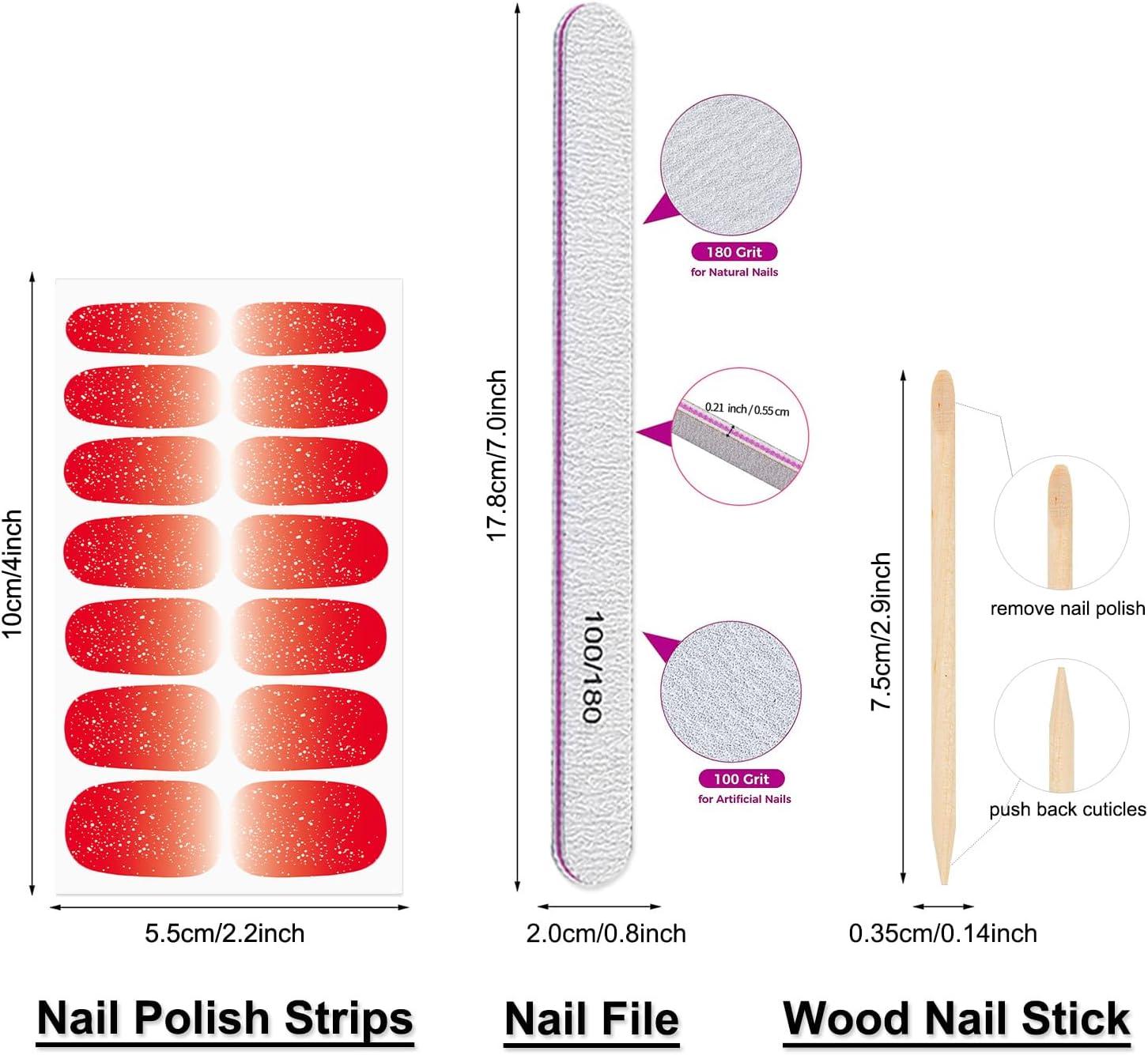 - [Package Included] You will get 16 sheets glitter nail wraps, each nail strips has 14 pieces nail tips and 7 sizes, to suitable for most people's nail size. the attached nail file and cuticle stick will help you finish the nail work better.