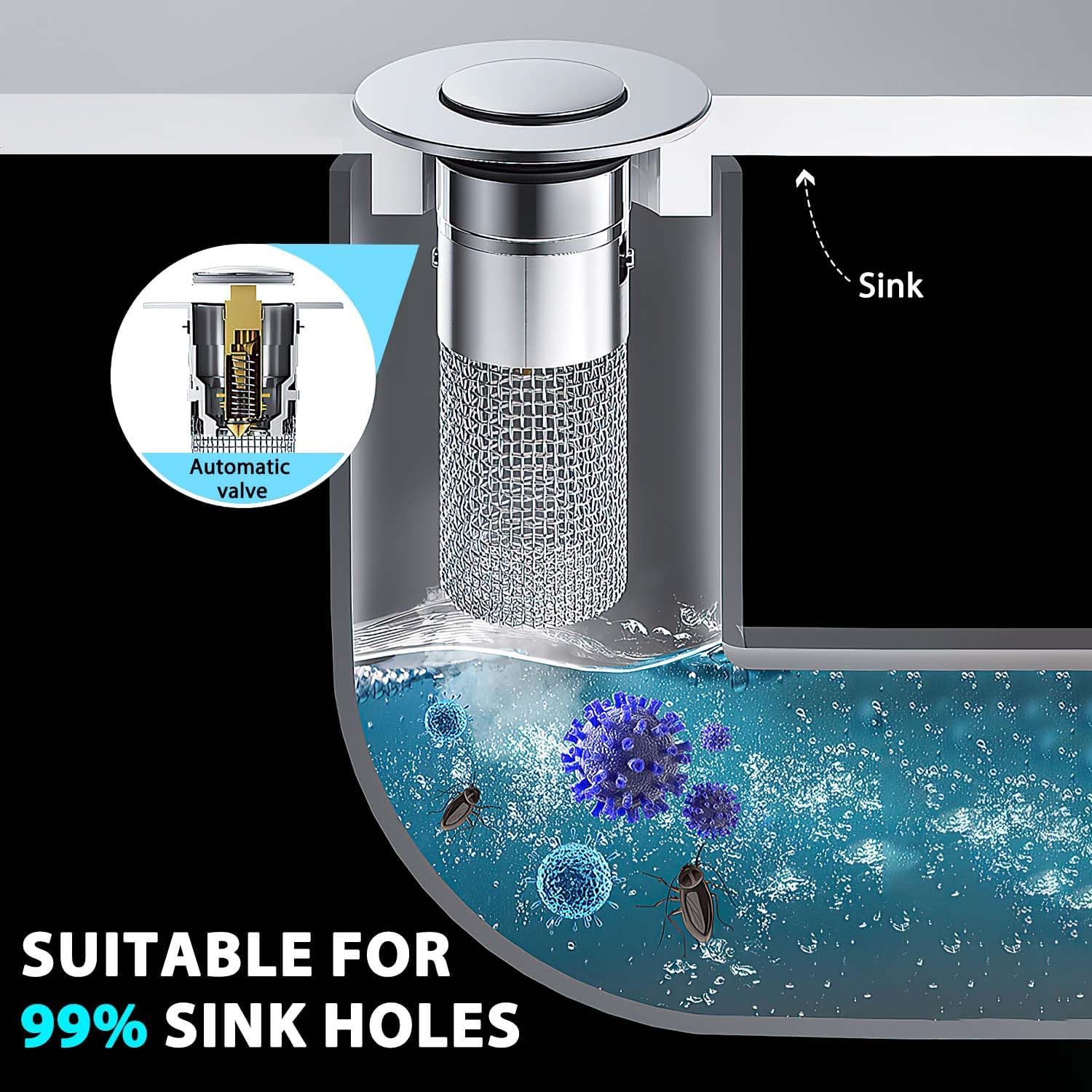 - 【Drain Faster & No Residue Water】- The sink drain plug has a beautiful bullet core thrust shape. Good rebound strength, drainage is fast and smooth with a single press,pop-up sink plug is designed with a built-in clogging basket that captures hair and other debris, preventing them from entering the drain. This helps to maintain efficient drainage and prevents clogging issues