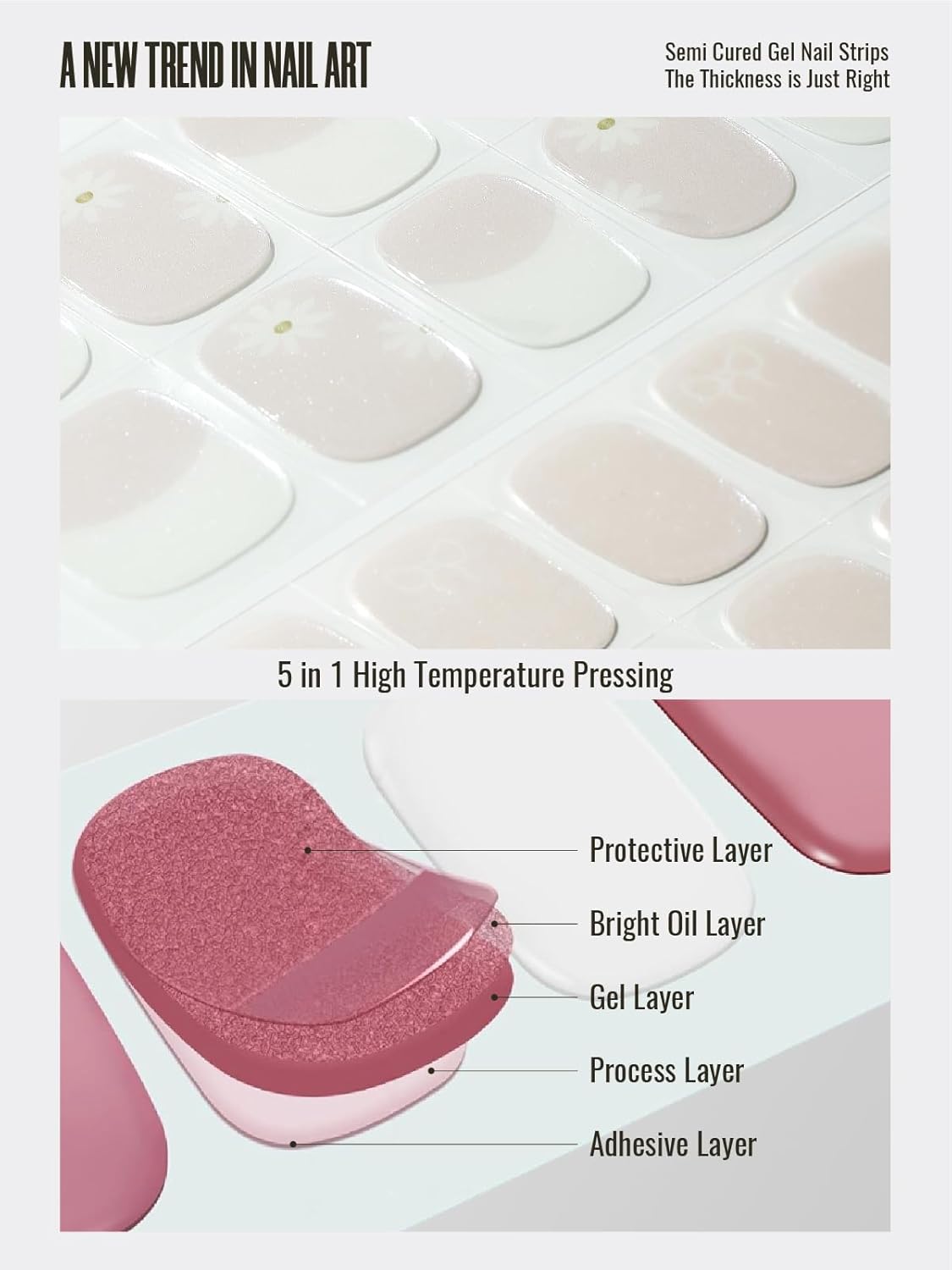 - 【REAL GEL NAIL STRIPS SET】Our nails strips are made with real gel, which means they are only 60 percent cured so they remain stretchy and flexible for application.Unlike flimsy nail stickers, these strips are supposed to feel like and last as long as a gel manicure.You don't get manicures anymore thanks to these semi cure gel nail strips that keep your nails damage-free.