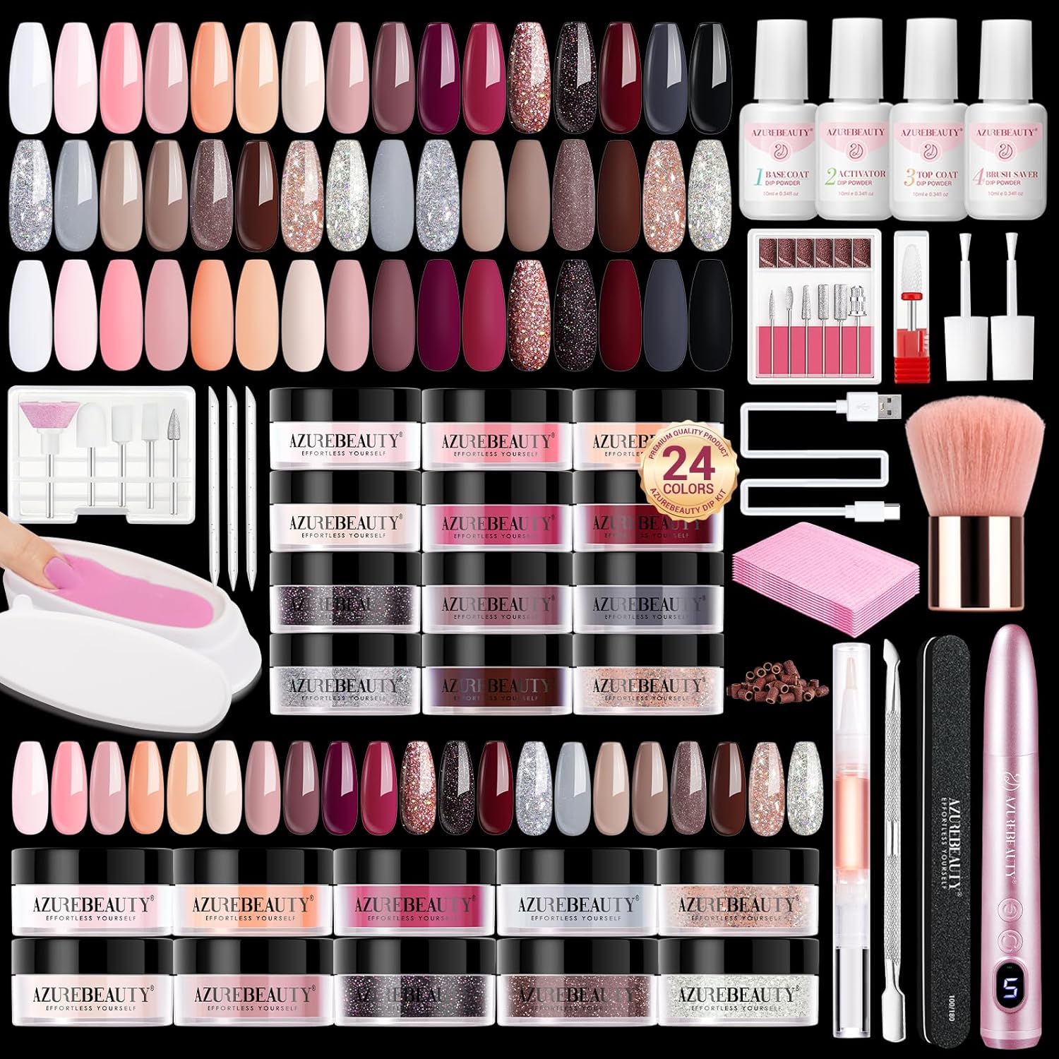 - 【92Pcs Complete Manicure Kit】 AZUREBEAUTY dip nails powder starter kit includes 24*0.16 oz gorgeous colors of nail dip powder, 4*0.33 oz dip powder liquid set(base coat/activator/topcoat/brush saver), 1*Portable Electric Nail Drill, 11* drill bits, 10 *table mat, 1*Ceramic Corn Head, 1*type-c charging cable, 30*sanding band, 1*cuticle oil pen, 3*nail sticks, 1*nail file, 1*dust brush, 1*recycling tray, 2*liquid replacement brush, 1*storage bag; and user manual quick start guide