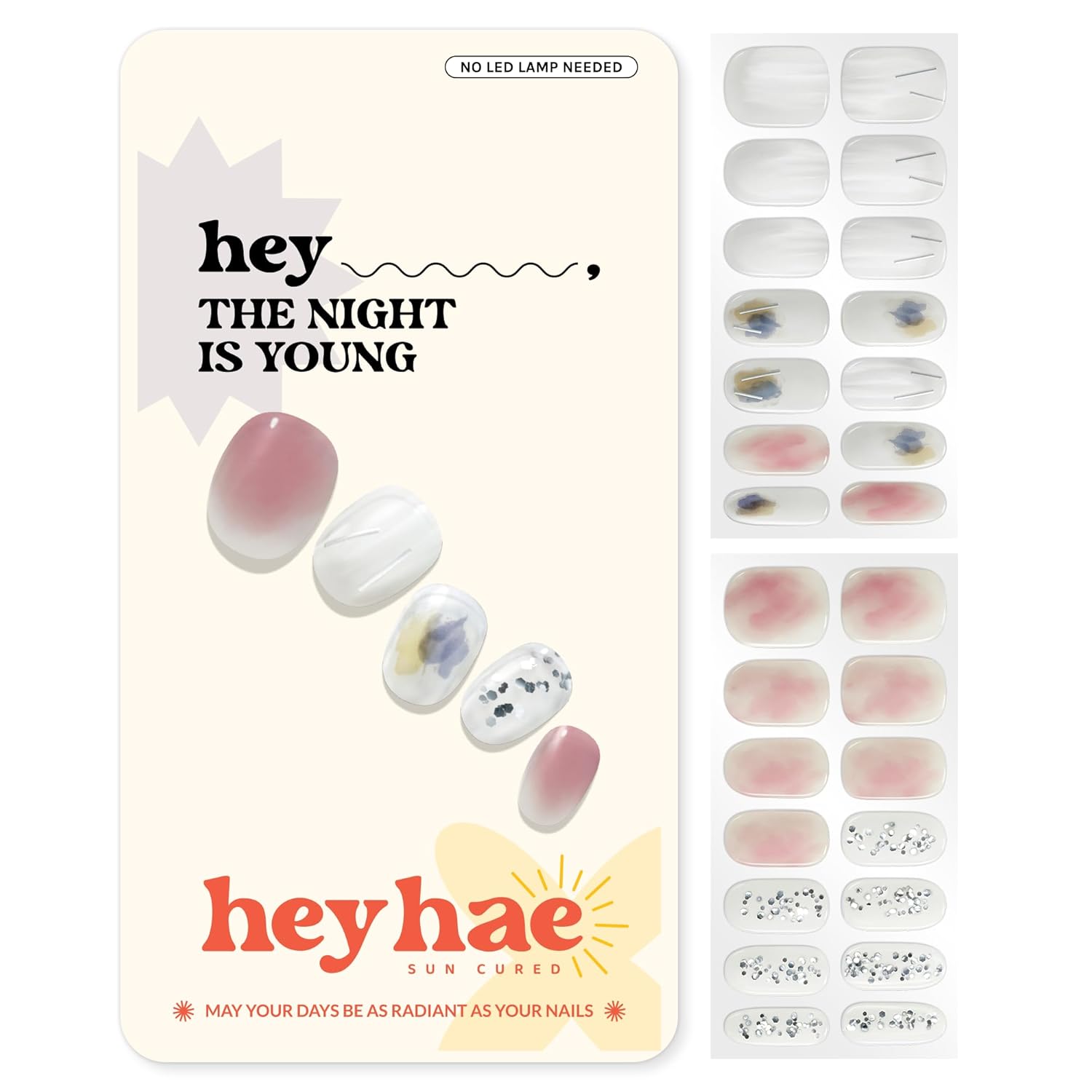 Semi Cured Gel Nail Strips | No LED Lamp Needed | Glam, Pink, Spring | Easy Apply & Remove, Salon Quality | Includes 28 Strips, 1 Prep Pads, Nail File & Wooden Stick - Hey, The Night is Young