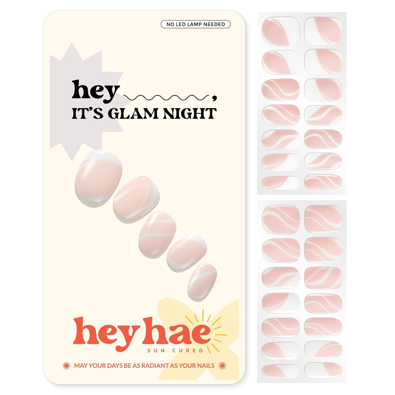 Semi Cured Gel Nail Strips | No LED Lamp Needed | French, Pink, Spring | Easy Apply & Remove, Salon Quality | Includes 28 Strips, 1 Prep Pads, Nail File & Wooden Stick - Hey, It's Glam Night