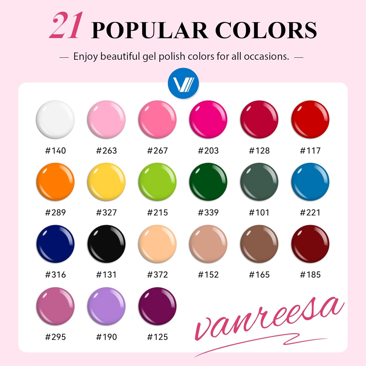 - 【Relaxing Vacation Series Colors】VANREESA's handpicked 21 colors of gel nail polish set includes currently popular shades: white, pink, red, orange, yellow, green, blue, purple, brown, nude, black, etc. These gel polish colors are currently trendy, versatile and practical, suitable for all styles. You can choose any color to match and combine to create your own unique manicure style!