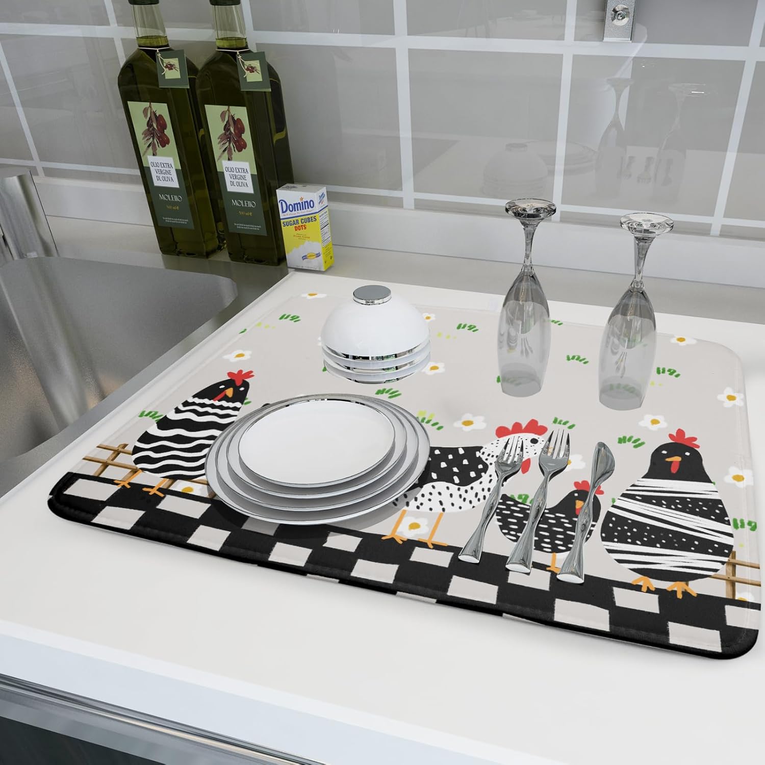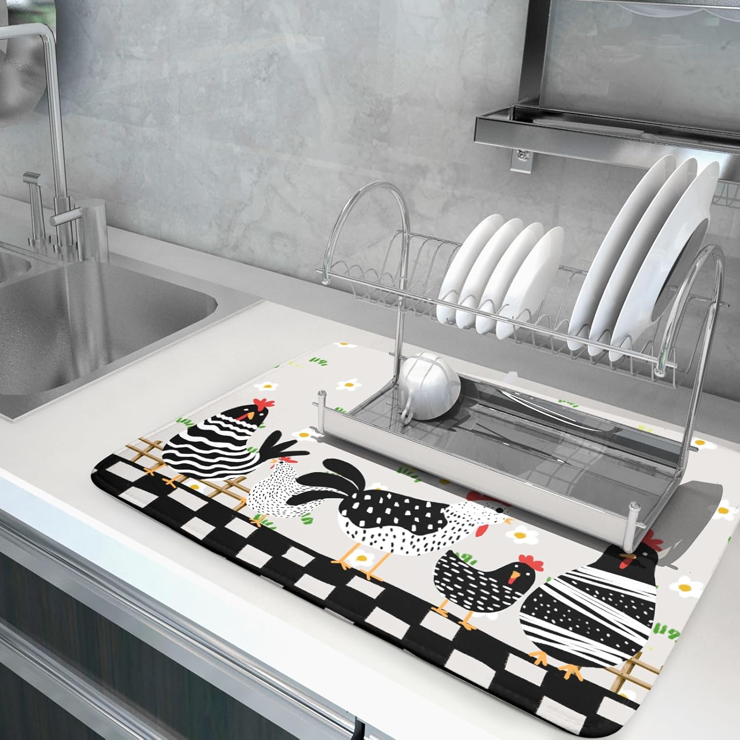 Black Rooster Dish Drying Mat for Countertop 18x24 Inches Buffalo Plaid Microfiber Drainer Rack Pads Fast Dry Dishes Mats Kitchen Accessories