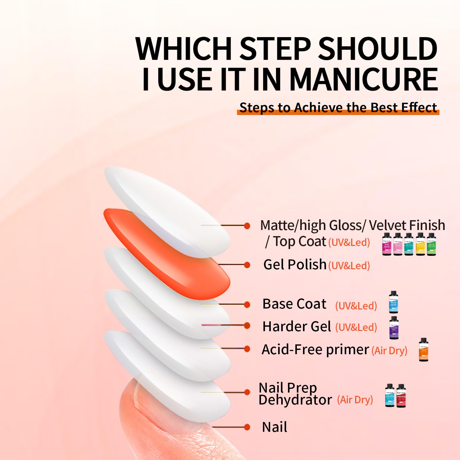 - Finger Secret Acid-Free Primer:Finger secret acid-free primer innovative quick-drying formula, fast air dry no need to wait. When you use finger secret acid-free primer, you can immediately proceed with subsequent manicure steps, significantly saving manicure gel nail polish time.