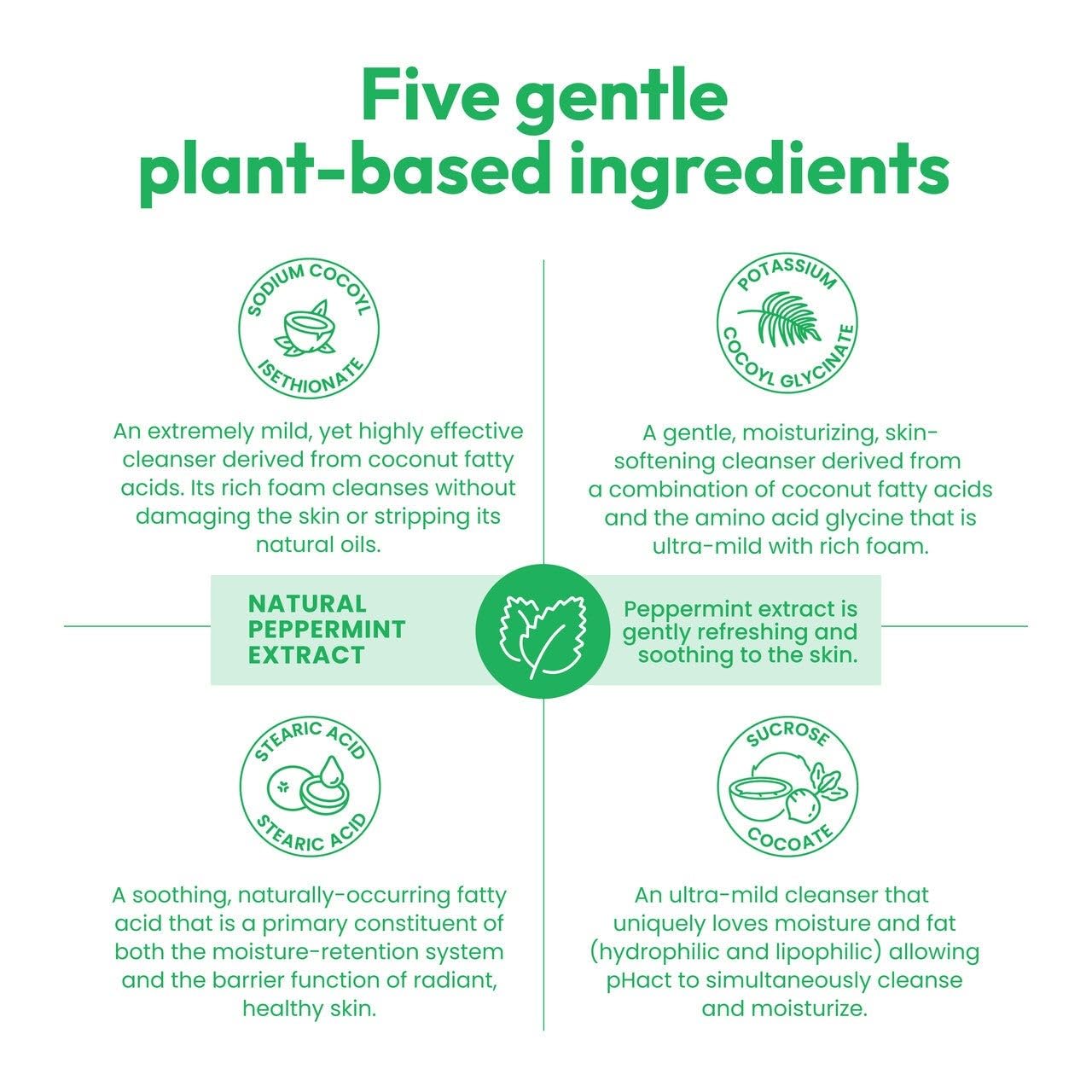 - pHact is a unique soap-free, moisture-rich, natural skin pH cleansing bar. Its rich lather provides a gentle, yet highly effective cleansing experience that will not dry or irritate the skin. pHact is made with only five plant-based ingredients and it is uniquely dermatologist, pediatrician, ophthalmologist and gynecologist tested. pHact Hint of Mint is infused with natural peppermint extract, leaving your skin feeling gently refreshed with every wash.