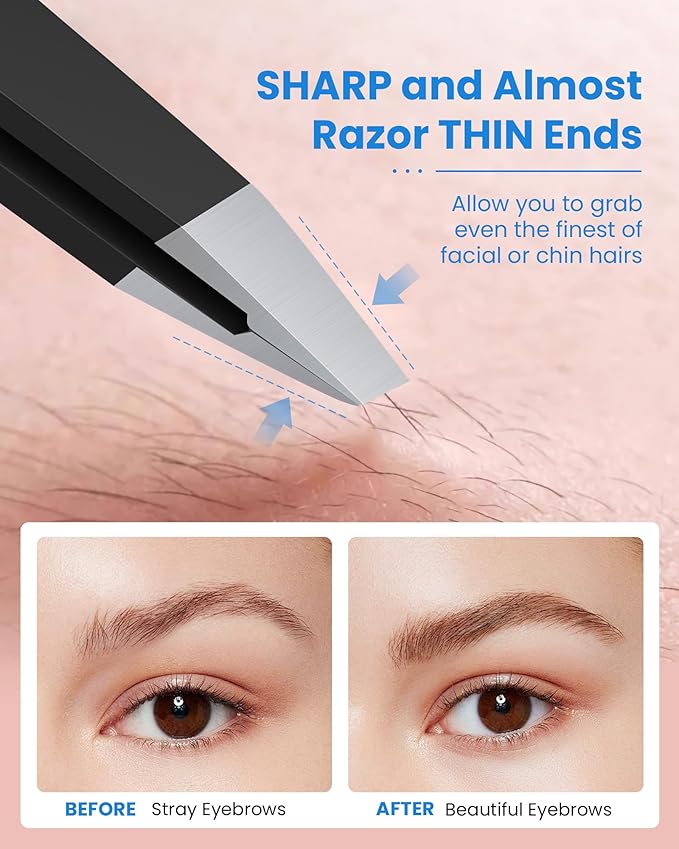 - 【Sharp SLANT TIPS for Every Hair】25° slanted tip is the perfect angle for removing unwanted hair. These ultra-fine tips grip the tiniest hairs effortlessly - from peach fuzz to stubborn chin hairs. Unlike flimsy tweezers, our professional-grade design removes hairs cleanly without breakage. Perfect for women's facial hair care routines and men's grooming kits alike.