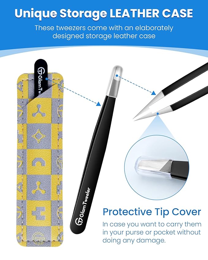 - 【Exclusive TRAVEL-READY Storage case】The GlamTweeler Expert Slant Tip Tweezers come with an elaborately designed storage leather case, which makes it easy and safe to carry in purse or for travel. This elegant storage pouch not only protects the tip's sharpness but also helps prevent accidental damage when not in use, very useful and convenient.