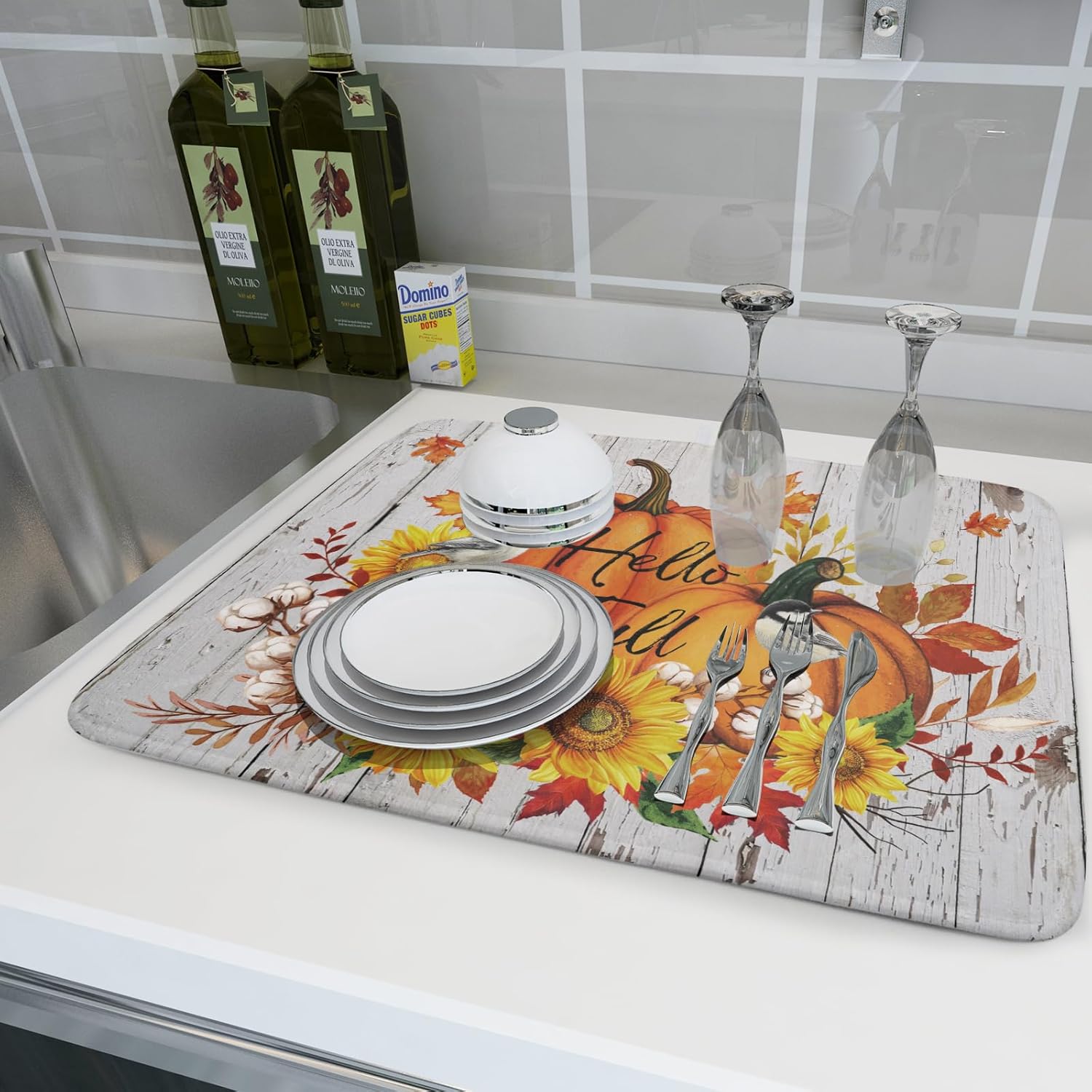 Hello Fall Dish Drying Mat for Kitchen Counter 18x24 Inch Orange Pumpkin Absorbent Drying Pad with Hanging Loop Autumn Home Decoration