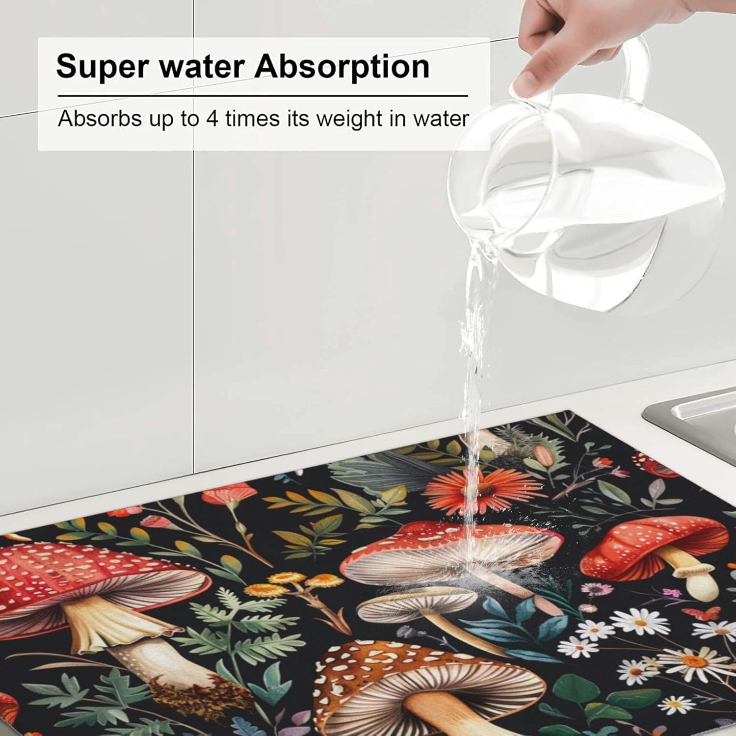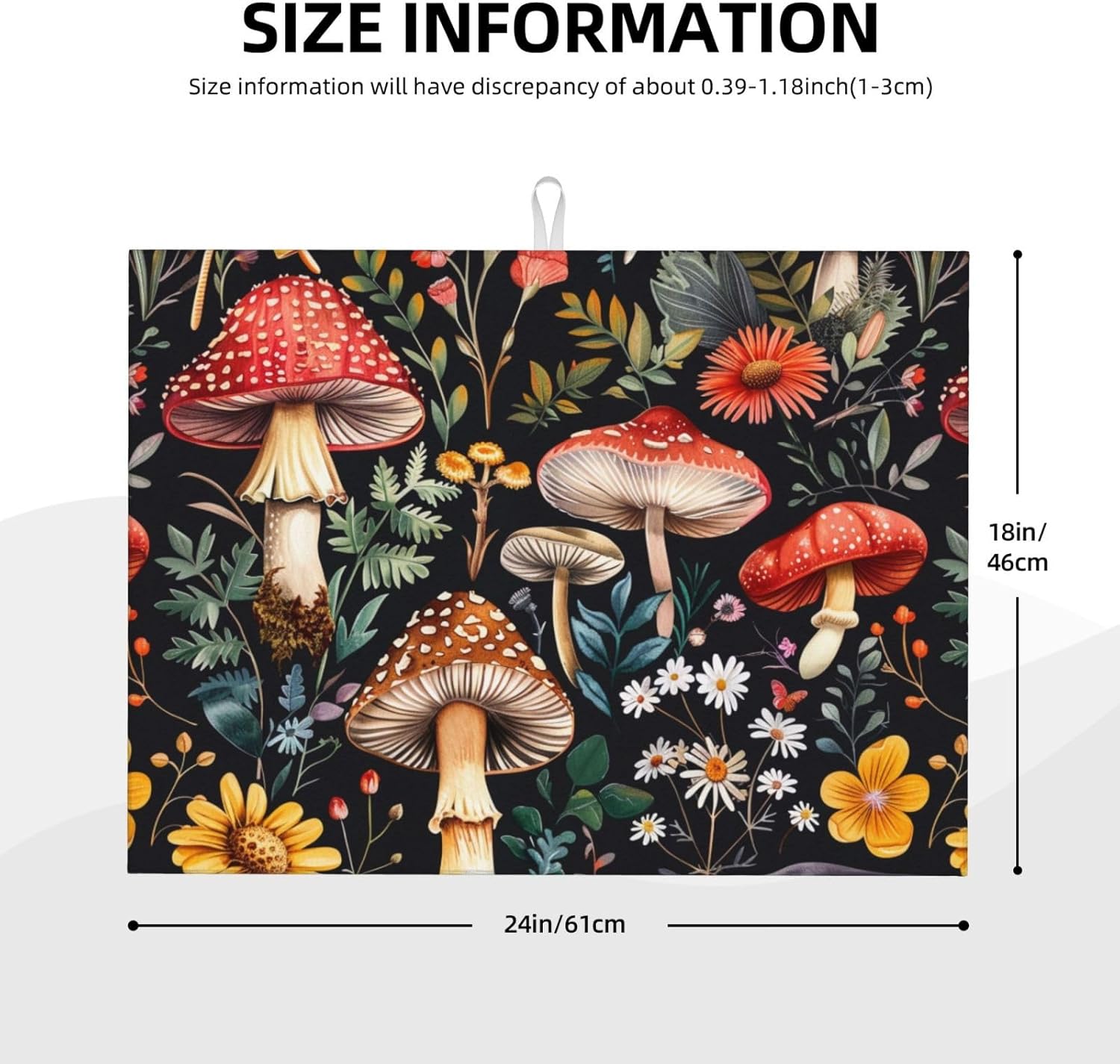 Forest Floral Mushroom Dish Drying Mat For Kitchen Counter Absorbent Large Kitchen Fast Dry Pad Reusable Washable Protector Rack Large Mat 18 X 24