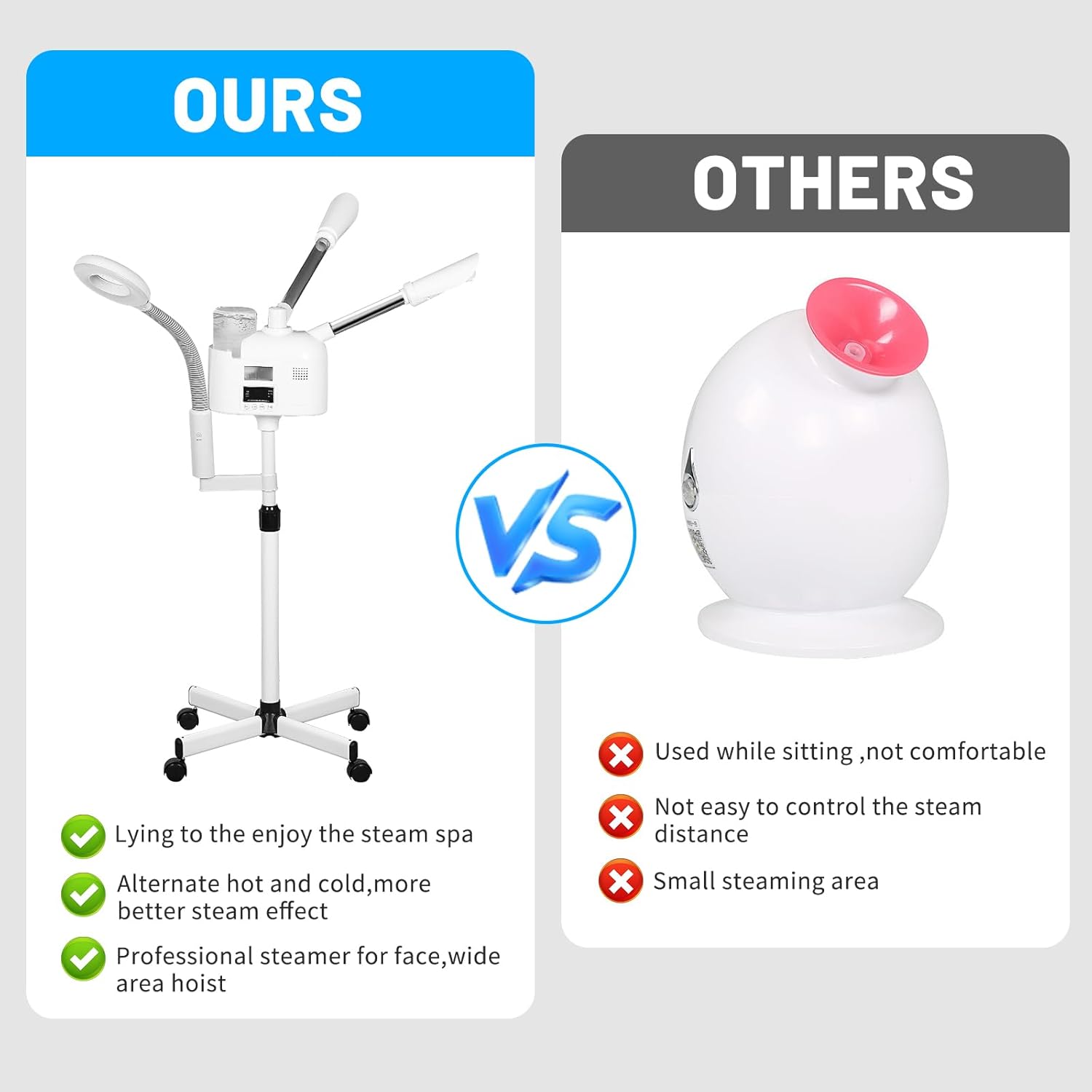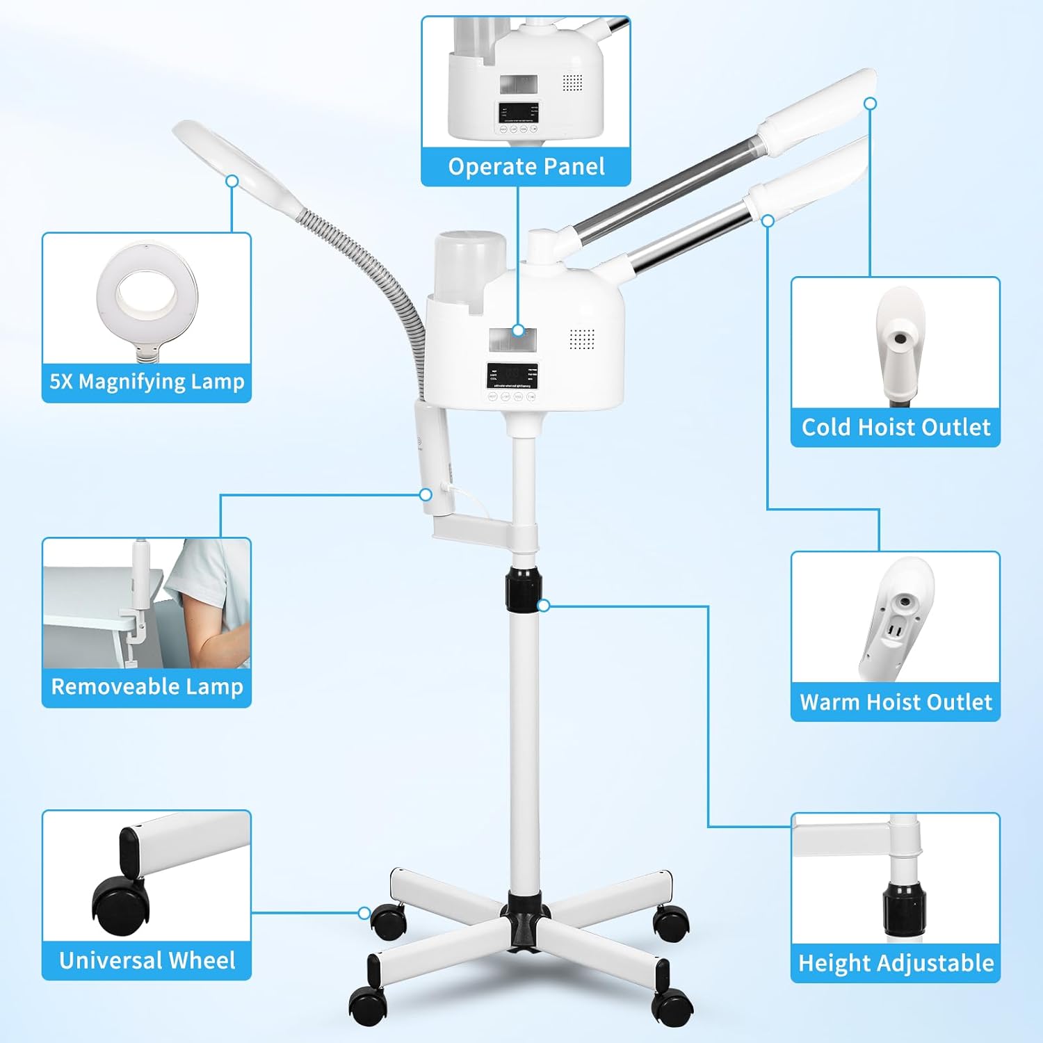 Pro Rolling Facial Steamers for Face Professional 3 in 1 Facial Steamer Humidifier with 5X Mag Lamp,Face Steamer Standing Warm Cold Mist Digital LCD Screen for Home Salon Spa