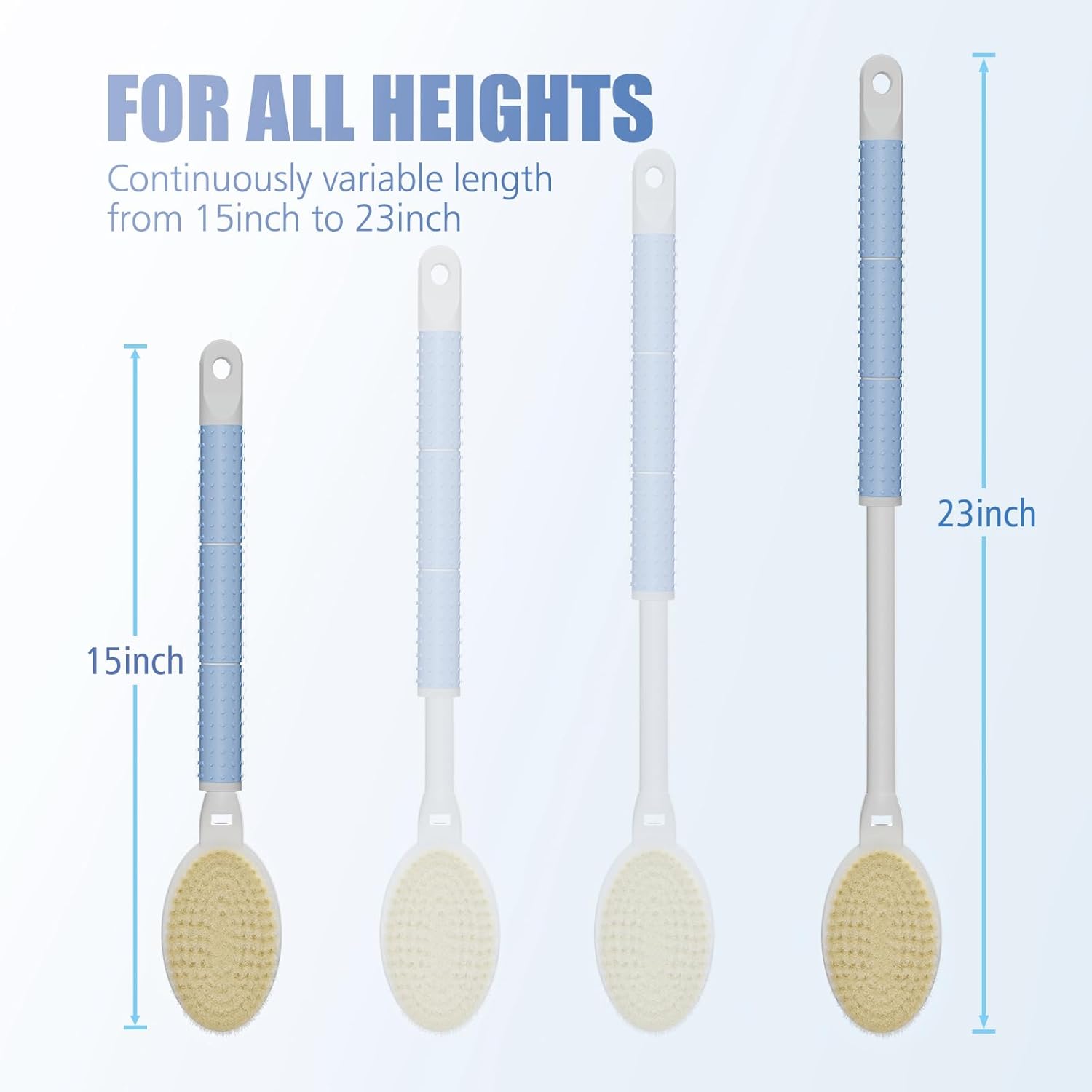 - TELESCOPIC LONG HANDLE BACK BRUSH - For People of All Heights.15"~23" Long Adjustable Handle Dual-Sided Back Scrubber to Srub all those Hard to Reach Places,such as the Back and the Feet.Just aline the block of the inner and external handle the pull the handle to the length you need.