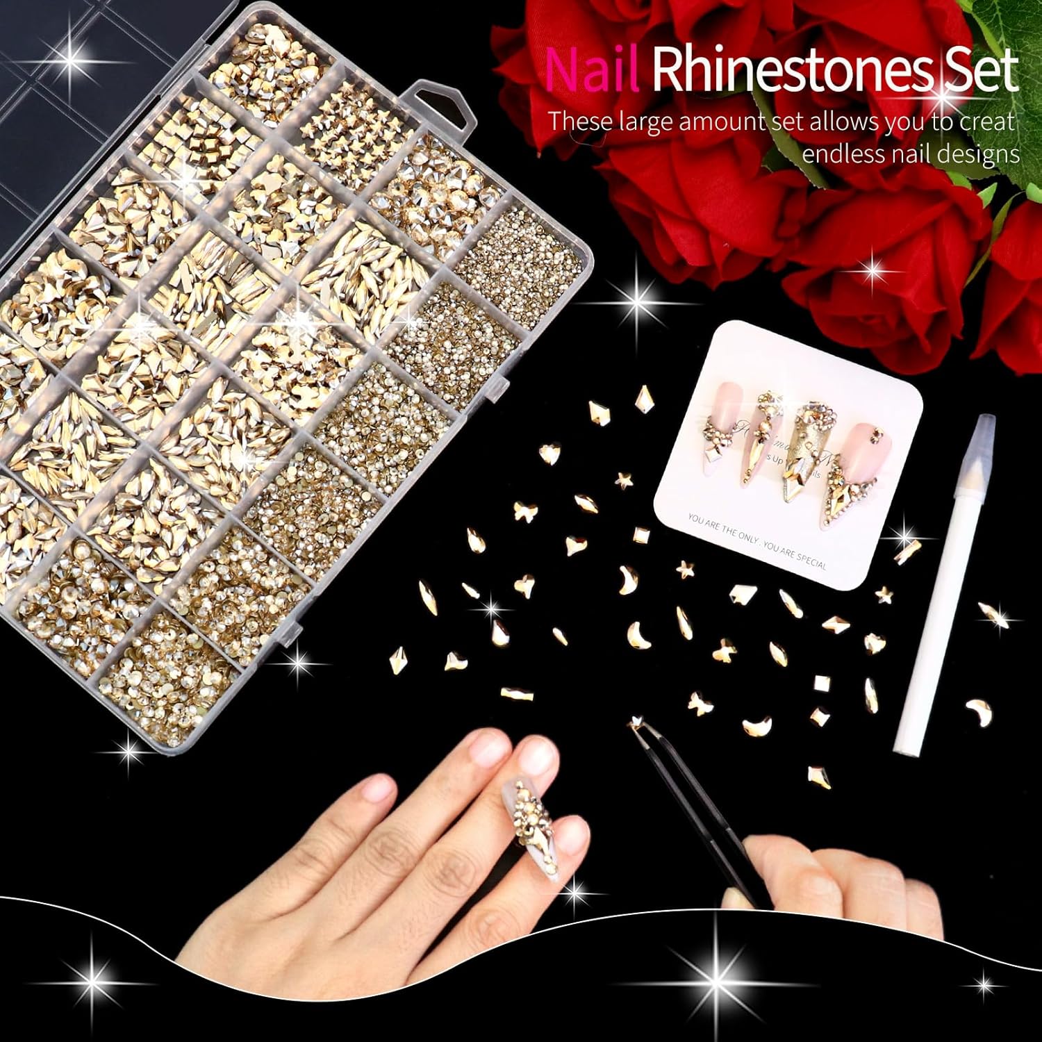 - 🌺 You Will Receive: A large box of gold champagne nail crystal rhinestone set, includes 16 styles of 800pcs special-shaped diamond, 50pcs/style; 5200pcs round flatback rhinestones in 8 sizes, with one wax picker pencil and one pair of tweezers.