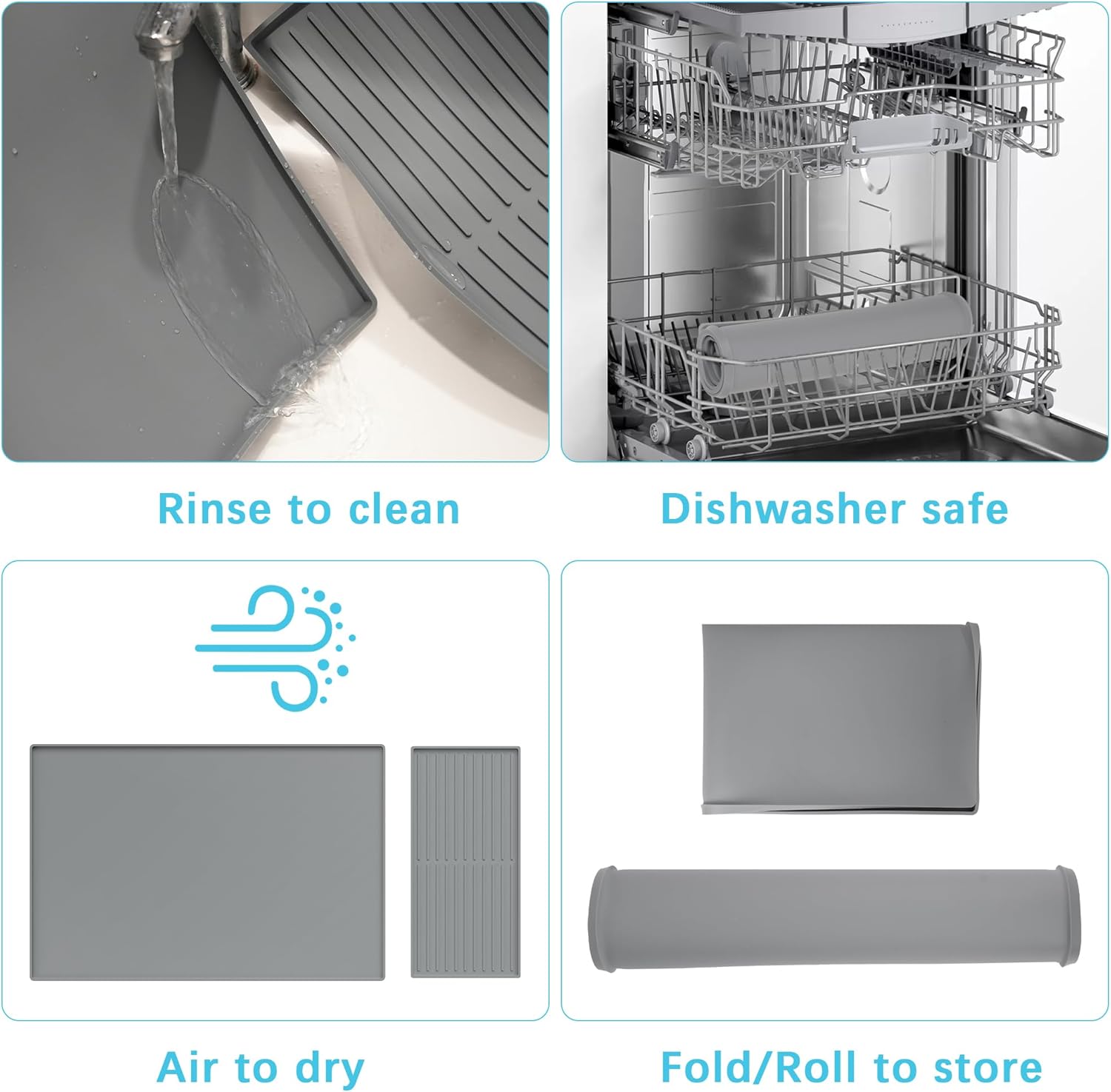 - ๐๐๐ฌ๐ฒ ๐ญ๐จ ๐๐ฅ๐๐๐ง ๐๐ง๐ ๐๐ญ๐จ๐ซ๐: The silicone mat is simple to cleanโjust wipe off spills or place it in the dishwasher. Its soft and flexible material allows for easy rolling or folding, saving space in your kitchen. This dish drainer for kitchen counter is a essential item for first apartment can also be used as a drawer liner or a cabinet liner, also a good pet feeding mat.
